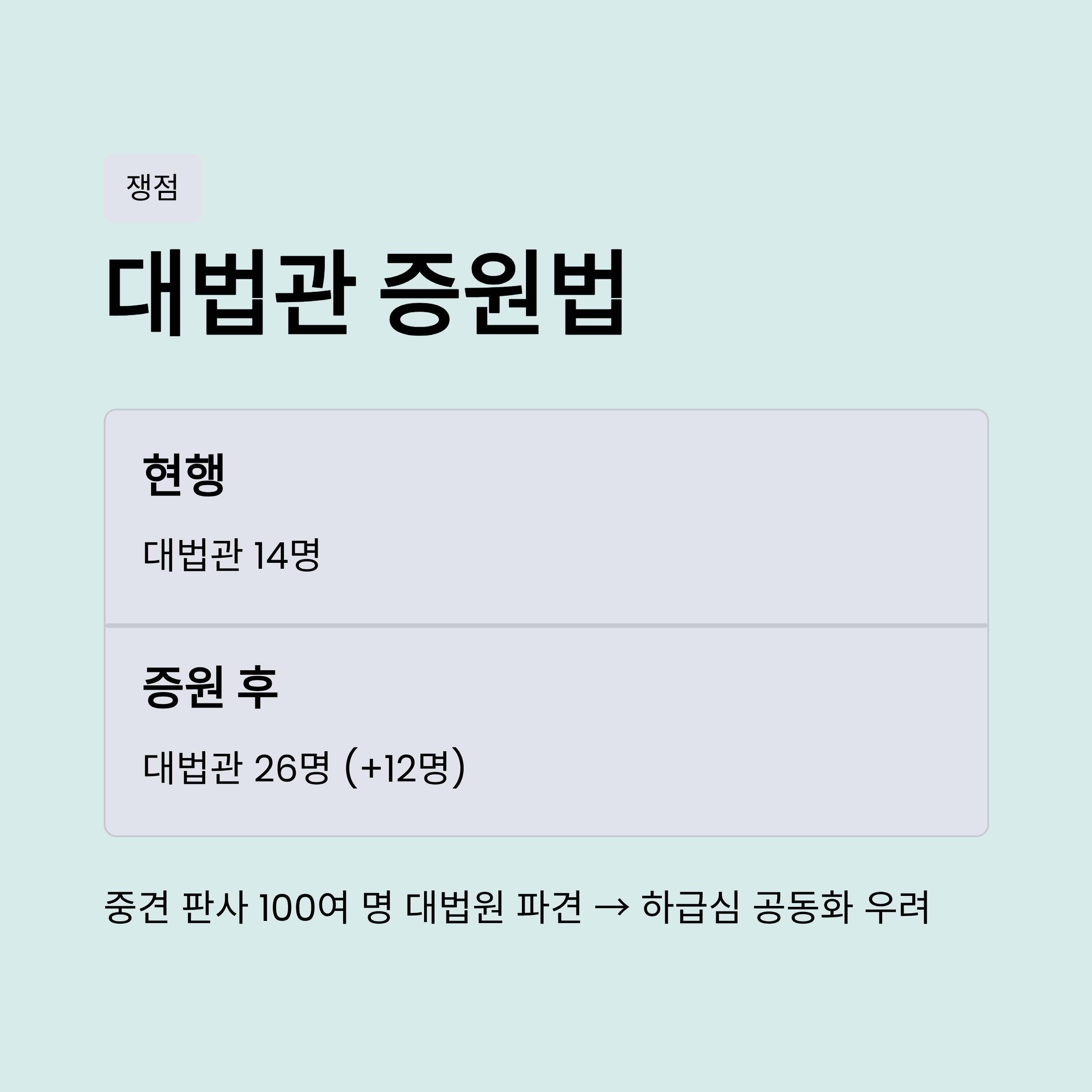 | 대법관 증원법(예고) | 대법관 현행 14명 → 26명으로 증원 (12명 증가) |