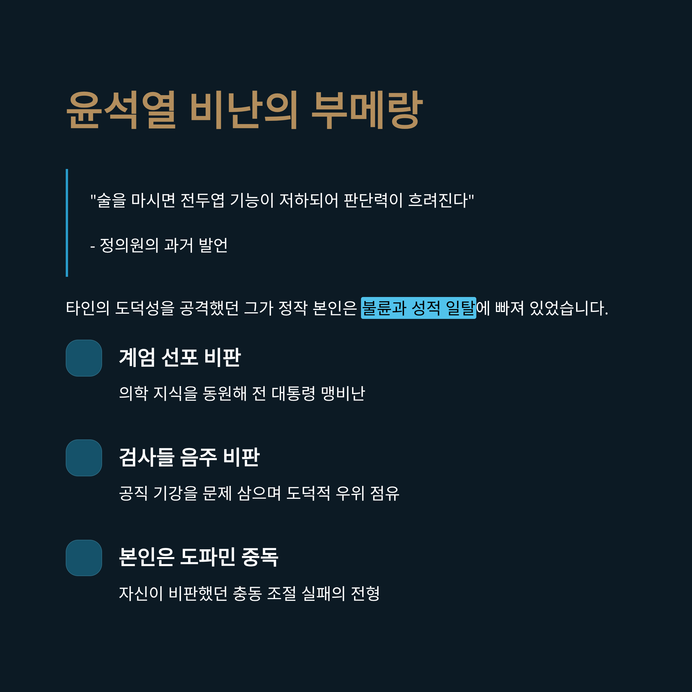 과거 윤석열 전 대통령의 음주를 비판했던 그의 행적이 재조명되며 '내로남불'이라는 비판과 함께 사회적 신뢰가 무너졌습니다.