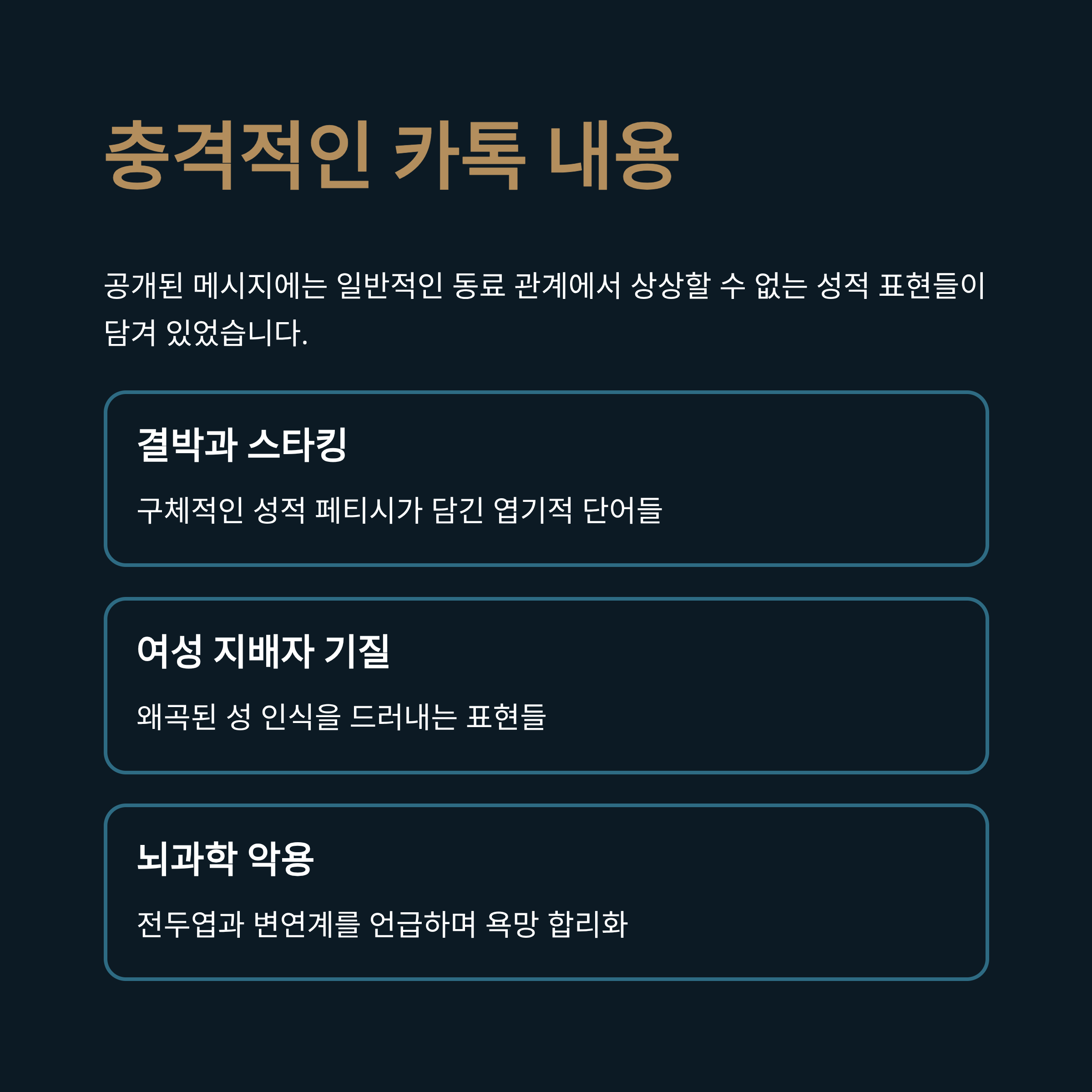이번 사건의 가장 큰 충격은 '건강 전도사'로 알려진 정의원이 보낸 카카오톡 메시지의 수위에 있습니다. 공개된 메시지에는 "결박", "스타킹", "여성 지배자" 등 일반적인 동료 관계에서는 상상할 수 없는 성적 페티시가 담긴 단어들이 나열되어 있습니다. 2025년 2월에 전송된 이 메시지들은 단순한 농담으로 치부하기에는 구체적이고 엽기적입니다. 이에 대해 정의원 측은 "이 내용은 소설이며, 인공지능이 만든 것"이라는 황당한 주장을 펼치고 있습니다. 이는 명백한 증거 앞에서도 반성보다는 기술적 핑계를 대며 책임을 회피하려는 전형적인 꼬리 자르기 행태로 해석됩니다.