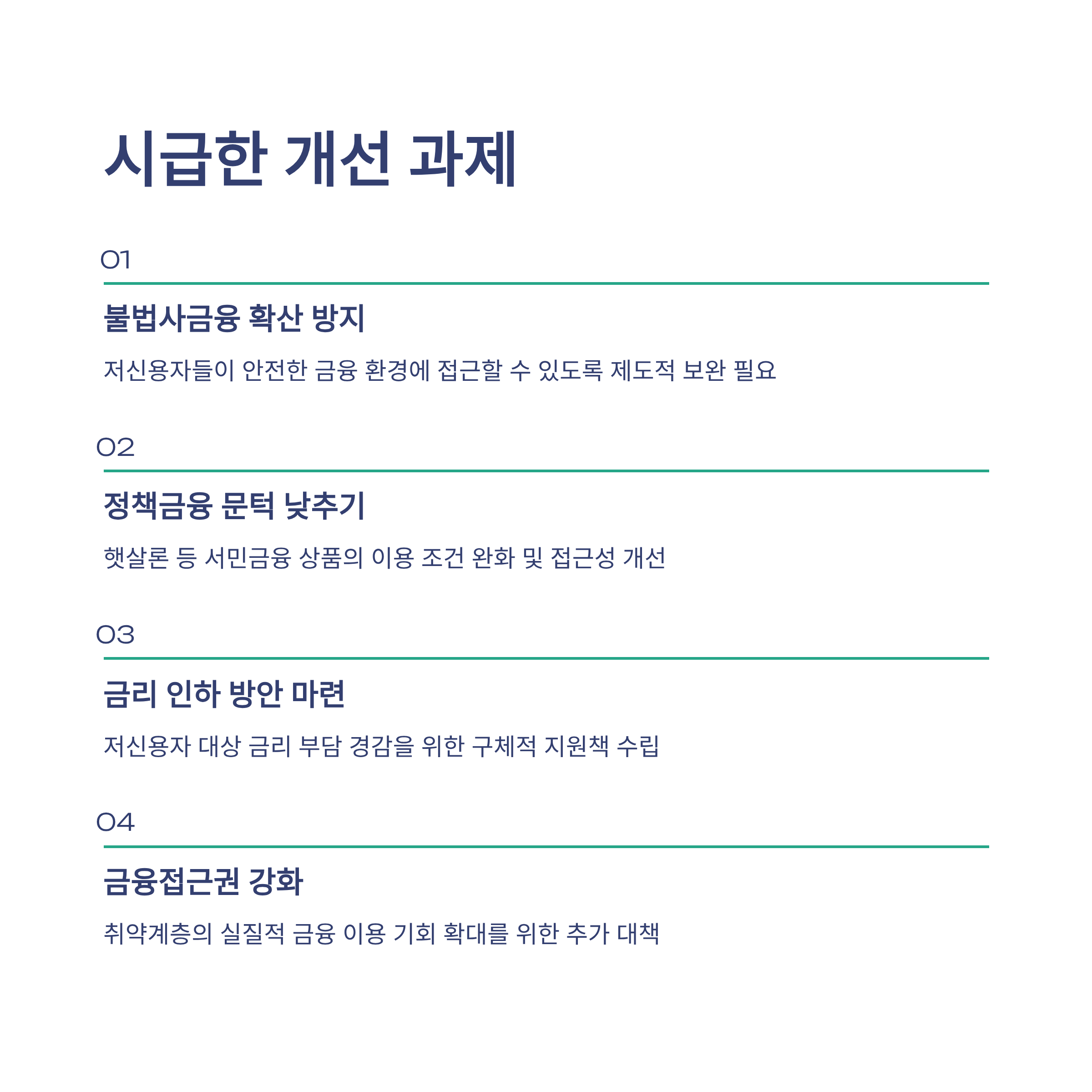 5. 저신용자들의 금융접근권 강화를 위한 추가 대책 마련이 긴급한 상황입니다.