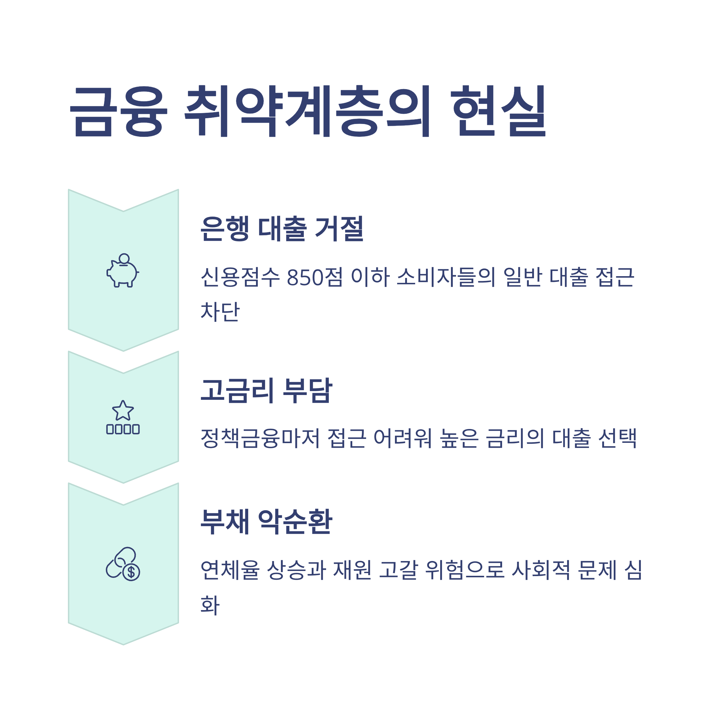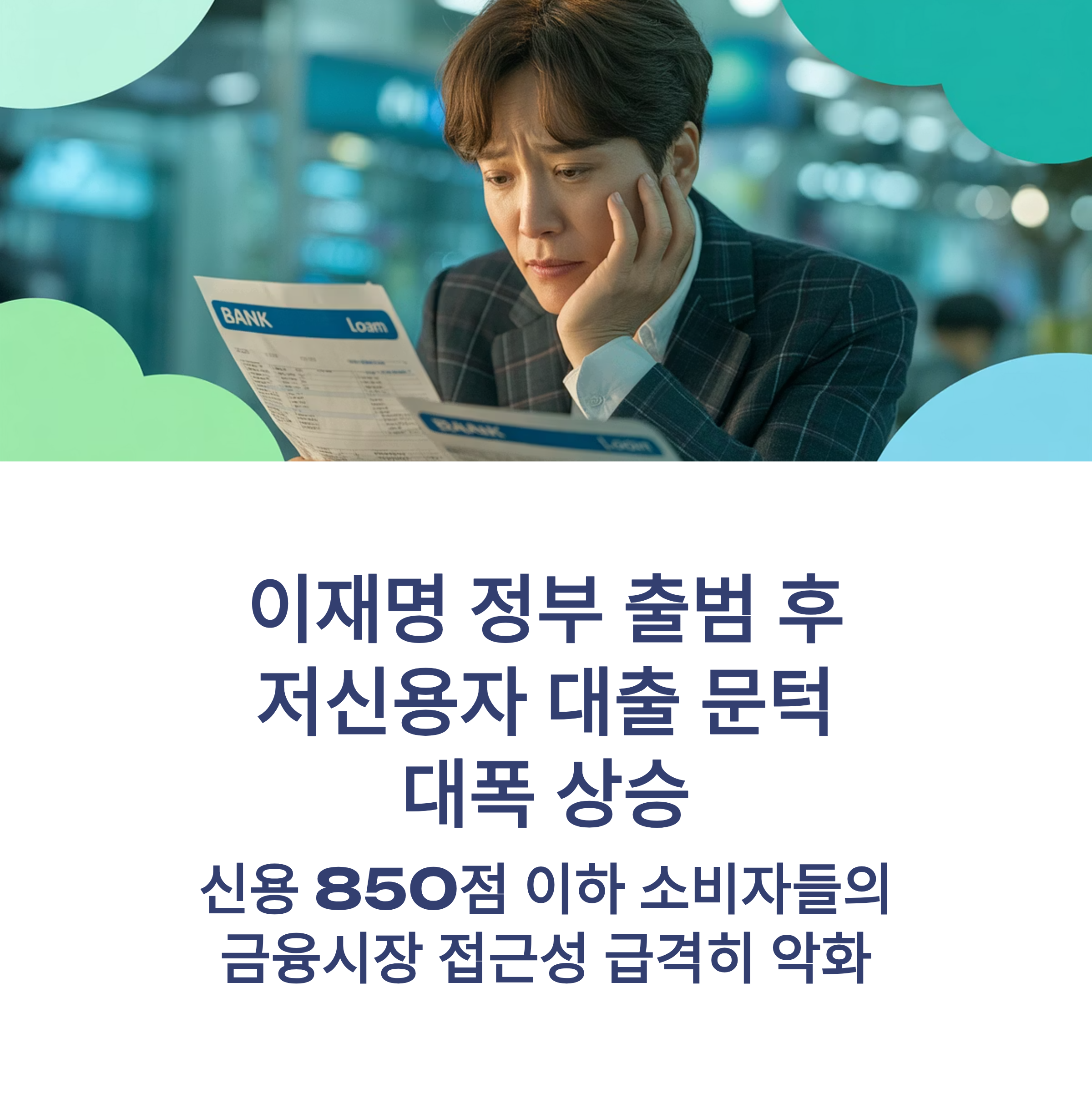 최근 대한민국 금융시장은 저신용자 및 중저신용자대출에 관한 논의로 뜨겁습니다. 이재명 정부 출범 이후 대출 문턱이 대폭 상승하면서, 신용 850점 이하의 소비자들에게 새로운 금융시장이 조정되고 있습니다. 그 과정에서 일부 대출 상품의 금리가 급등하고 접근성이 제한되면서 서민층과 취약계층의 경제적 부담은 더욱 심화되고 있습니다.