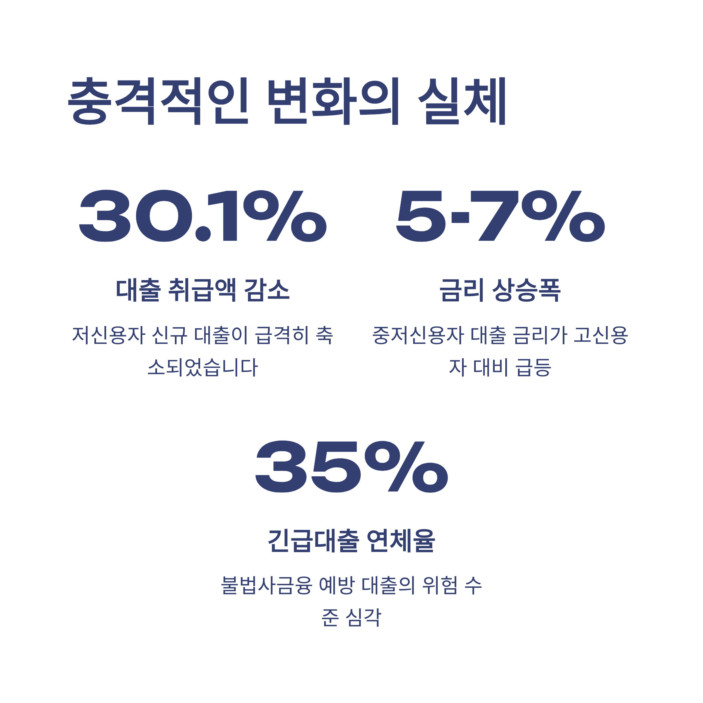 은행의 보수적 성향 강화와 함께 2025년 7월 시행된 신용대출 DSR 규제로 인해, 특히 1억 원 이상의 대출에서는 금리가 추가로 1.5%포인트 상향 조정되어 가계대출 축소 효과가 더욱 두드러졌습니다. 결과적으로, 금융 취약계층의 자금 접근성이 현저히 줄어들고 이들이 신용도의 벽에 부딪히는 상황이 심화되고 있습니다.