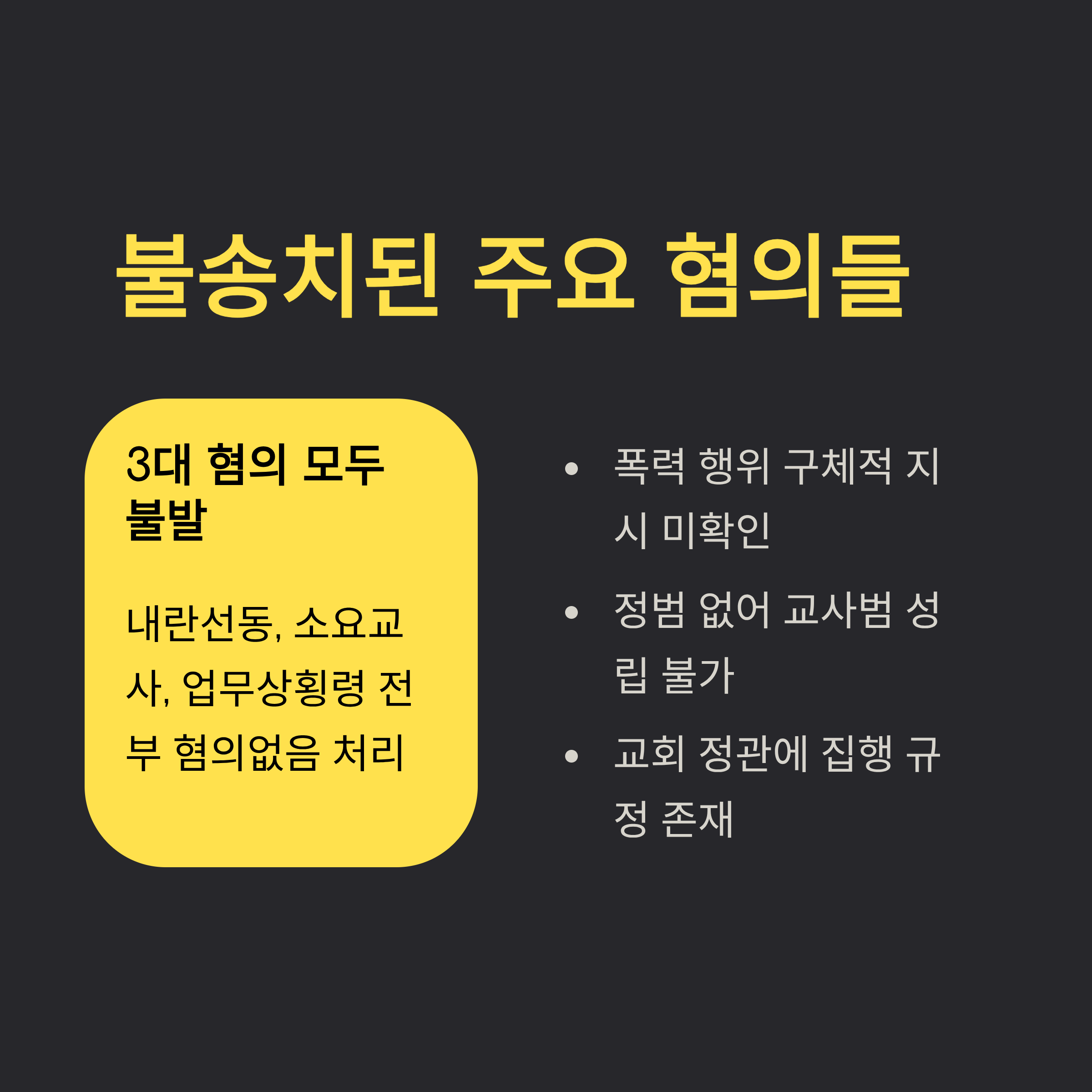 | 소요 교사 혐의 | 불송치 (혐의없음) | 현장 진입자(정범)가 '소요죄'로 처벌받지 않아 교사범 성립 자체가 불가능. |