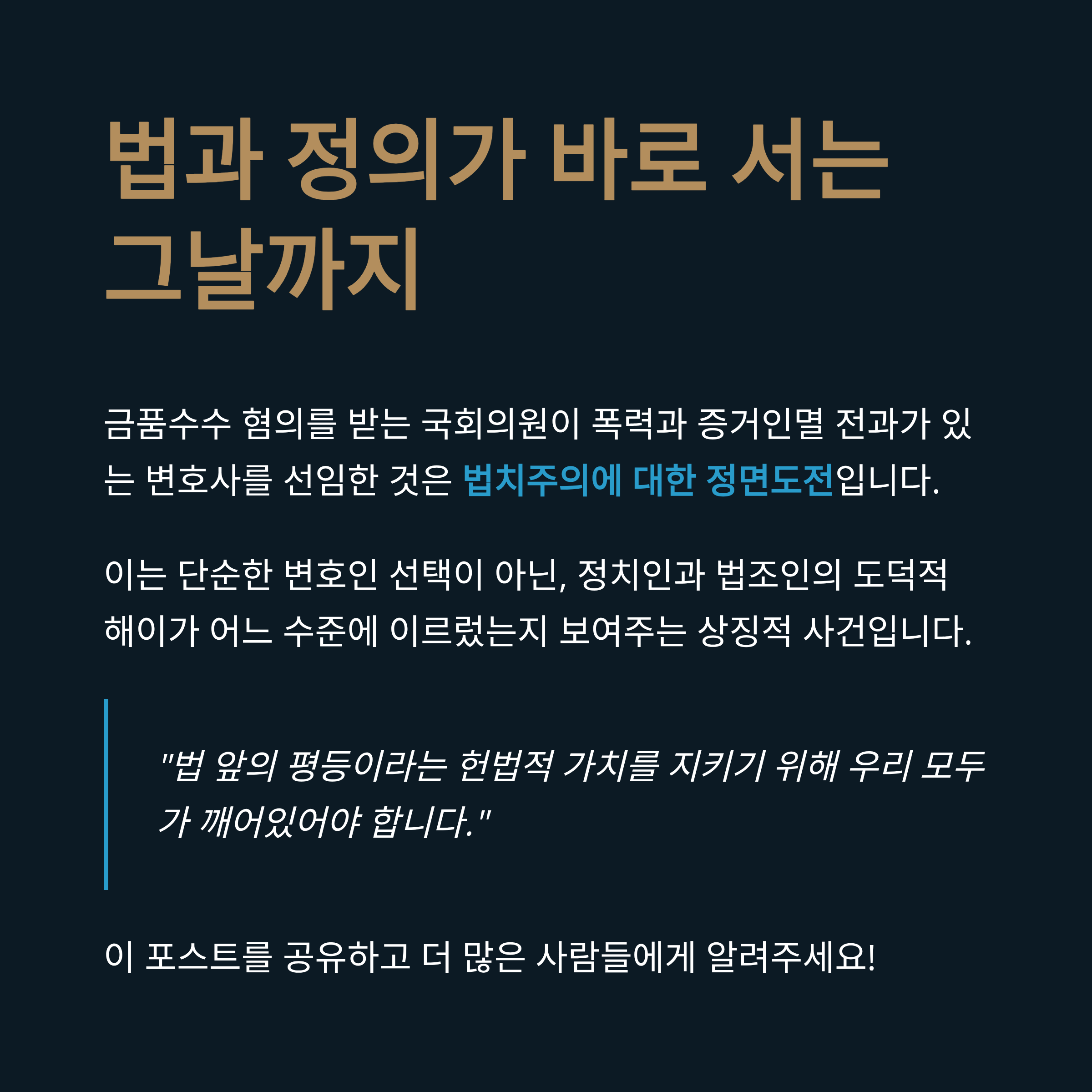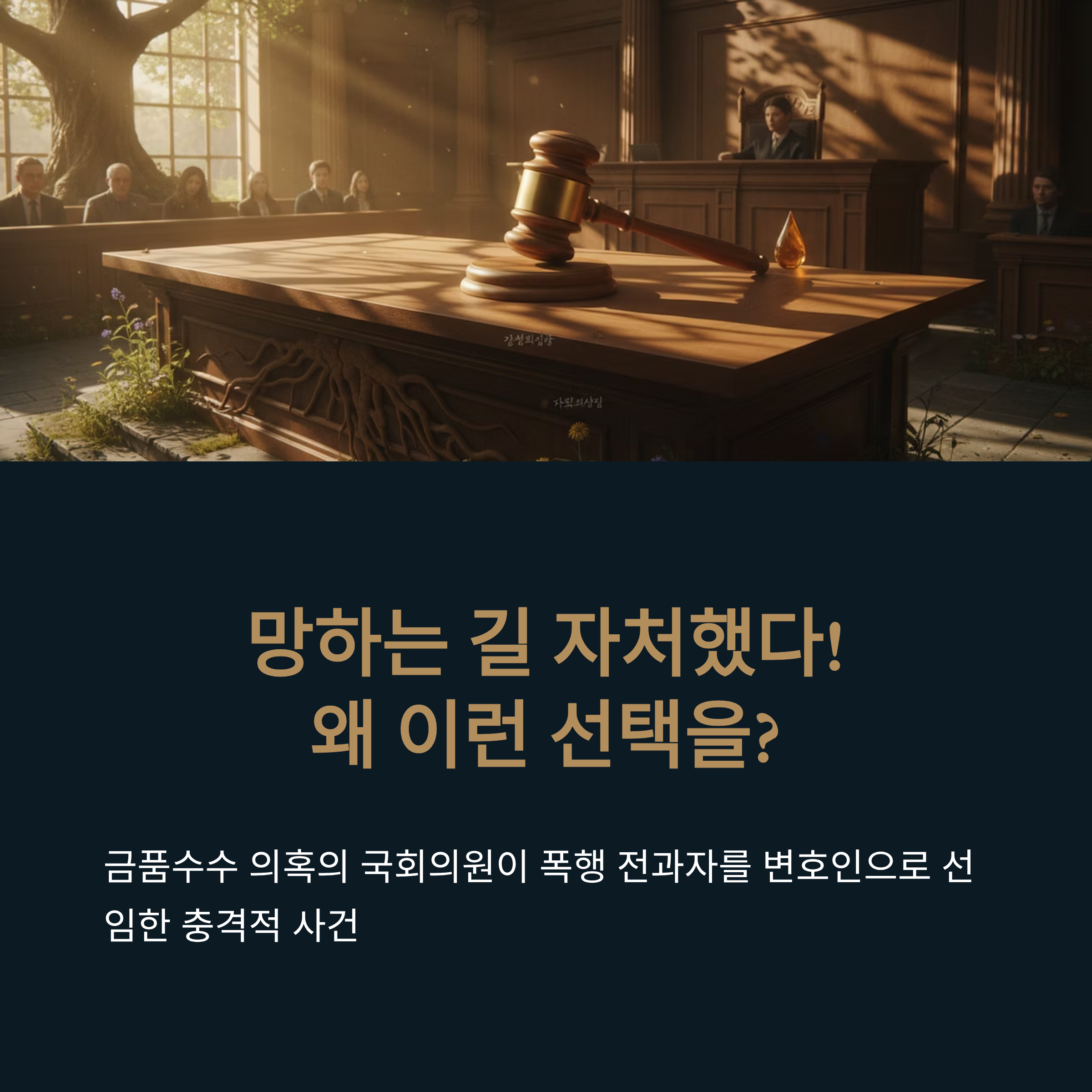 이는 단순히 개인의 변호인 선택권을 넘어, 정치인과 법조인의 도덕적 해이가 어느 수준에 이르렀는지를 보여주는 상징적인 사건입니다.