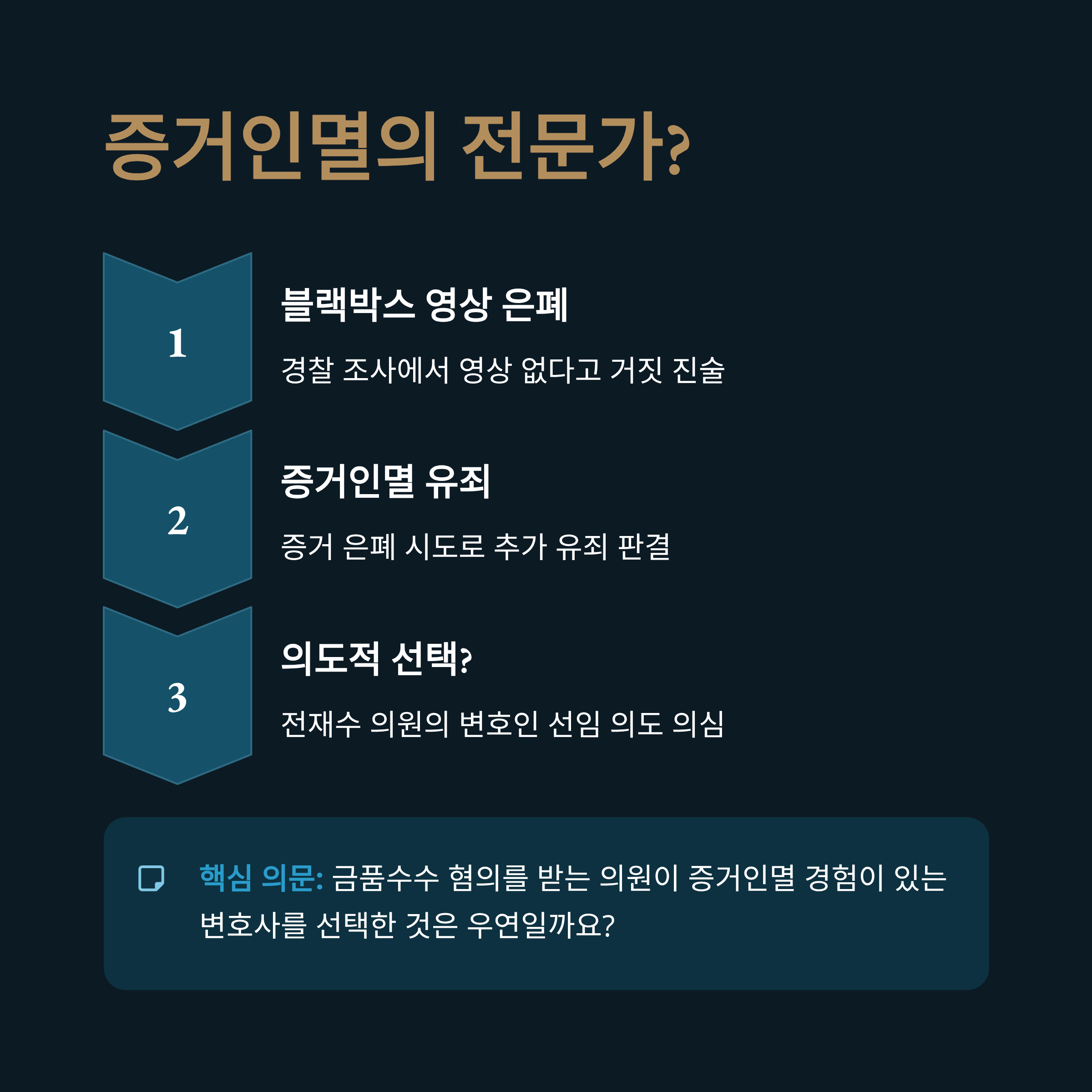 현재 혐의를 전면 부인하고 있는 전재수 의원이 자신의 사건을 방어할 변호사로 '증거인멸 경험'이 있는 인물을 선택한 것은 결코 우연으로 보기 어렵습니다.
