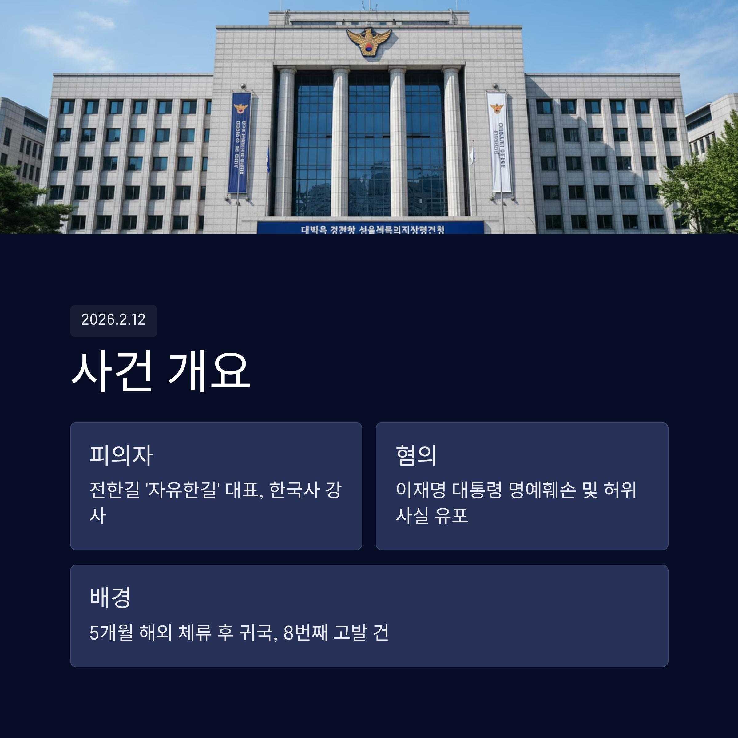 2026년 2월 12일 오전, 유명 한국사 강사이자 '자유한길' 대표인 전한길이 서울경찰청 형사기동대에 출석했습니다. 혐의는 현 이재명 대통령에 대한 허위사실 유포 및 명예훼손입니다. 전 대표는 지난 5개월간 해외 체류 후 귀국하여 경찰 조사를 받게 되었으며, 이는 현 정부 들어 그에게 제기된 여덟 번째 고발 건입니다. 그는 자신을 150억 원을 납세한 애국자라 칭하며, 이번 수사를 "정권의 표현의 자유 탄압"이라고 규정했습니다. 본 글에서는 전한길 대표의 주요 혐의와 그의 반박, 그리고 윤석열 전 대통령 구속 이후 급변하는 보수 우파 진영의 흐름을 분석합니다.
