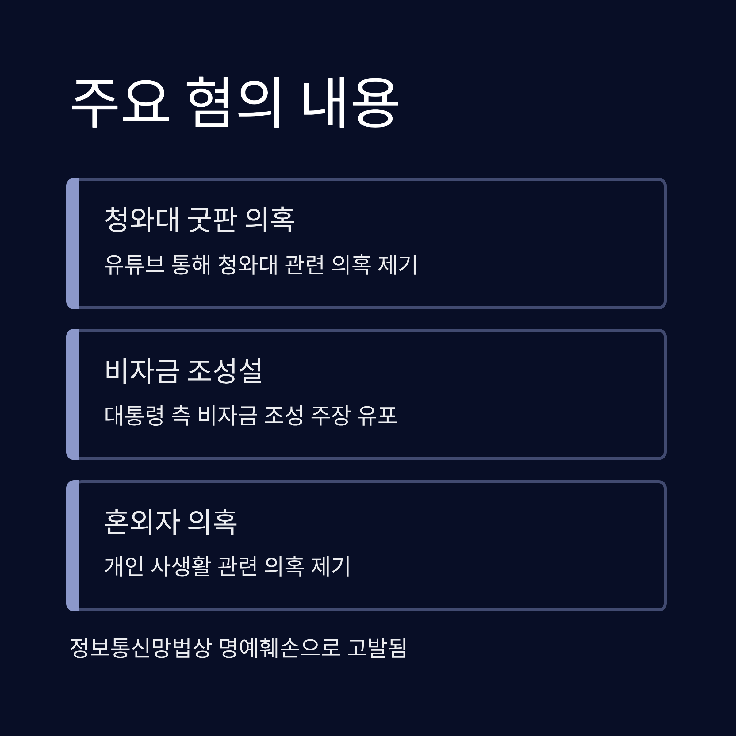 주요 혐의 내용: 유튜브를 통해 '청와대 굿판 의혹', '비자금 조성설', '혼외자 의혹' 등을 제기해 이재명 대통령 측으로부터 정보통신망법상 명예훼손으로 고발되었습니다.