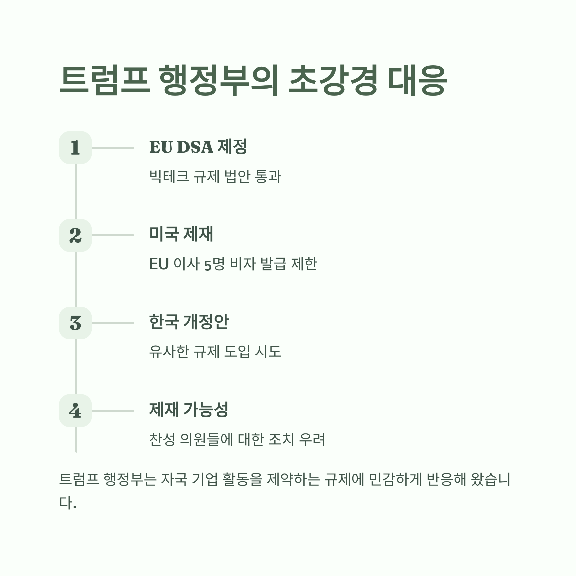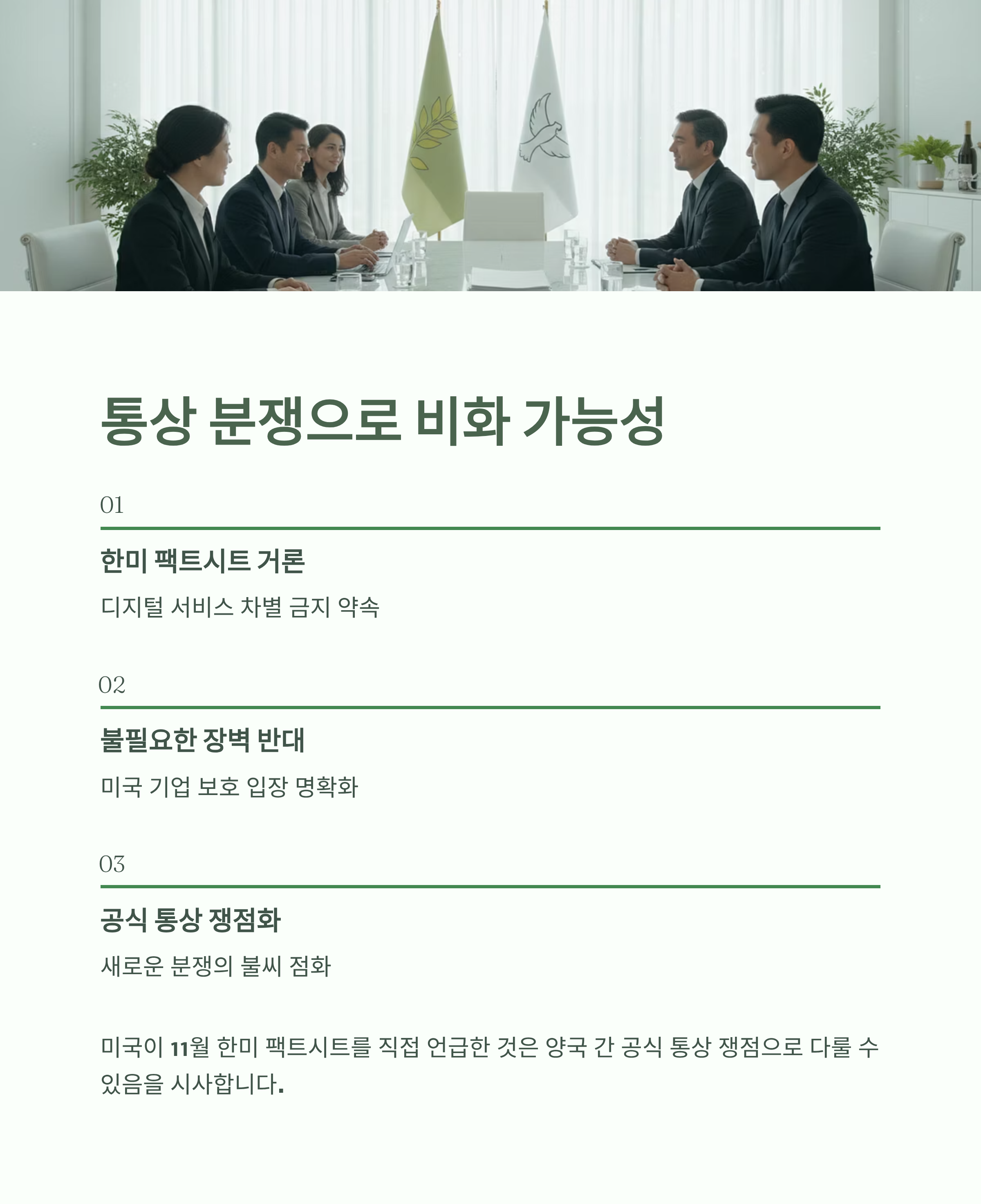 - 한미 통상 분쟁 가능성: 미국은 한미 간 합의된 팩트시트를 거론하며, 디지털 서비스에 대한 불필요한 장벽에 반대한다는 입장을 명확히 해 향후 통상 문제로 비화될 가능성을 시사했습니다.