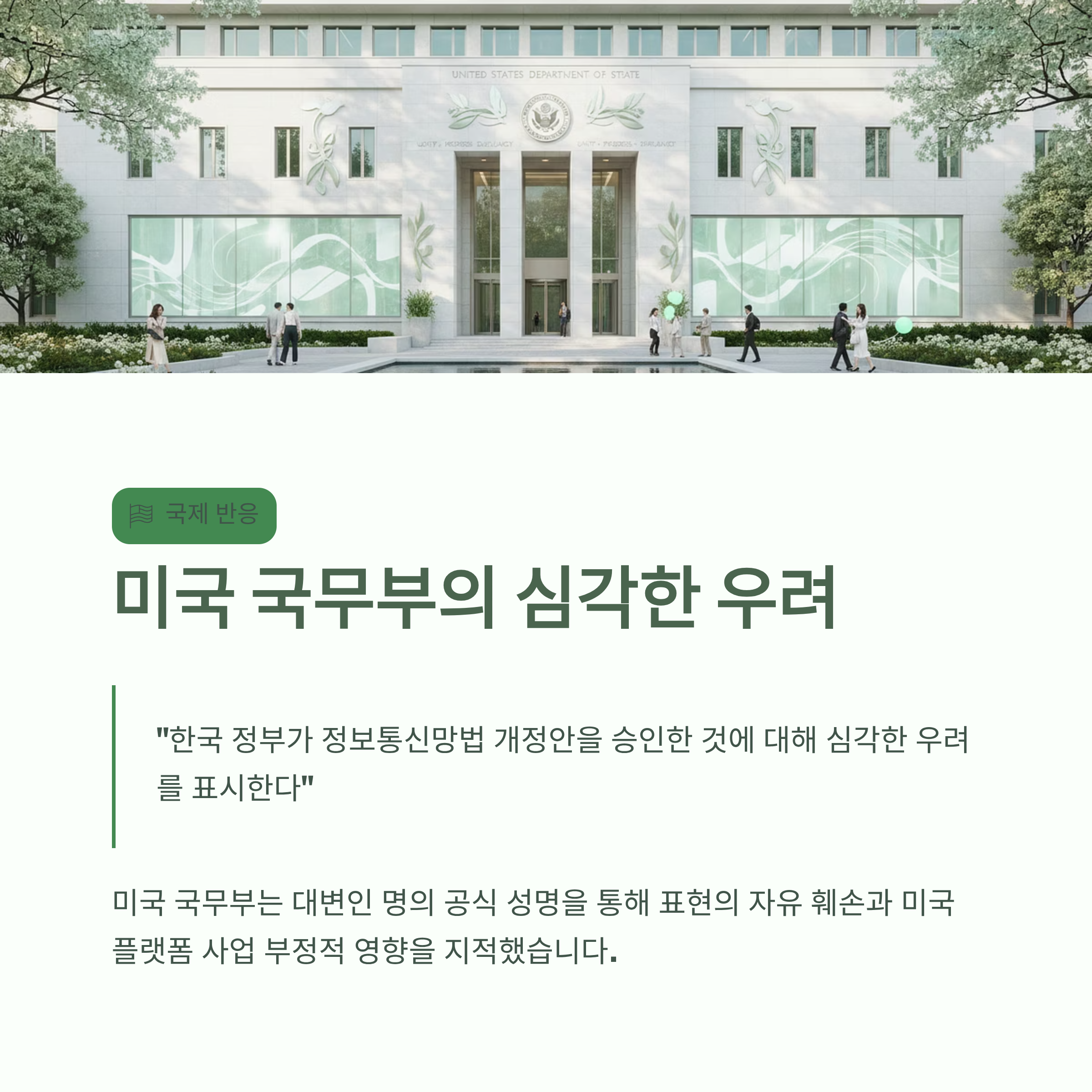 이 문제는 국내의 정치적 논쟁을 넘어 국제적인 외교 문제로 비화되고 있습니다. 미국 국무부는 이례적으로 대변인 명의의 공식 성명을 통해 "한국 정부가 정보통신망법 개정안을 승인한 것에 대해 심각한 우려를 표시한다"고 밝혔습니다. 미국은 이 개정안이 표현의 자유를 훼손할 뿐만 아니라, 유튜브, 페이스북, X(옛 트위터) 등 미국에 기반을 둔 온라인 플랫폼 사업에 부정적인 영향을 미칠 수 있다고 지적했습니다. 이는 자국 빅테크 기업의 이익 보호와 자유로운 디지털 환경 조성을 중요시하는 미국의 입장이 명확하게 드러난 대목입니다.