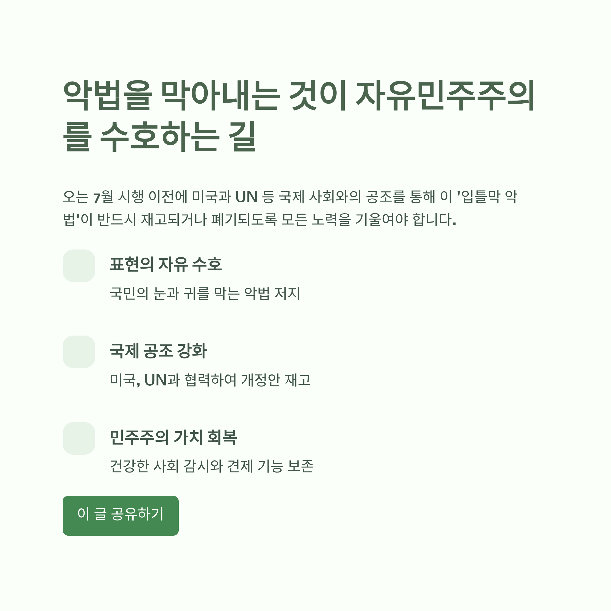 더 큰 문제는 이 법안이 초래할 외교적, 경제적 파장입니다. 우리의 핵심 동맹국인 미국은 국무부 공식 성명을 통해 '심각한 우려'를 표하며, 이를 자국 기업에 대한 차별이자 통상 장벽으로 간주할 수 있음을 분명히 했습니다. EU의 유사 법안에 대해 비자 발급 제한이라는 실질적 제재를 가했던 미국의 전례를 볼 때, 이는 결코 가볍게 넘길 사안이 아닙니다. 국내 정치적 이득을 위해 한미 동맹의 근간을 흔들고 새로운 통상 분쟁의 빌미를 제공하는 것은 국익에 전혀 도움이 되지 않는 자해 행위입니다. UN 등 국제 사회의 감시망에도 오른 지금, 이 법안은 대한민국을 표현의 자유 억압국이자 국제 규범을 무시하는 국가로 낙인찍히게 할 위험이 큽니다. 오는 7월 시행 이전에 미국과 UN 등 국제 사회와의 공조를 통해 이 '입틀막 악법'이 반드시 재고되거나 폐기되도록 모든 노력을 기울여야 합니다. 국민의 눈과 귀를 막고 국제적 고립을 자초하는 악법을 막아내는 것이야말로 자유민주주의를 수호하는 길입니다.