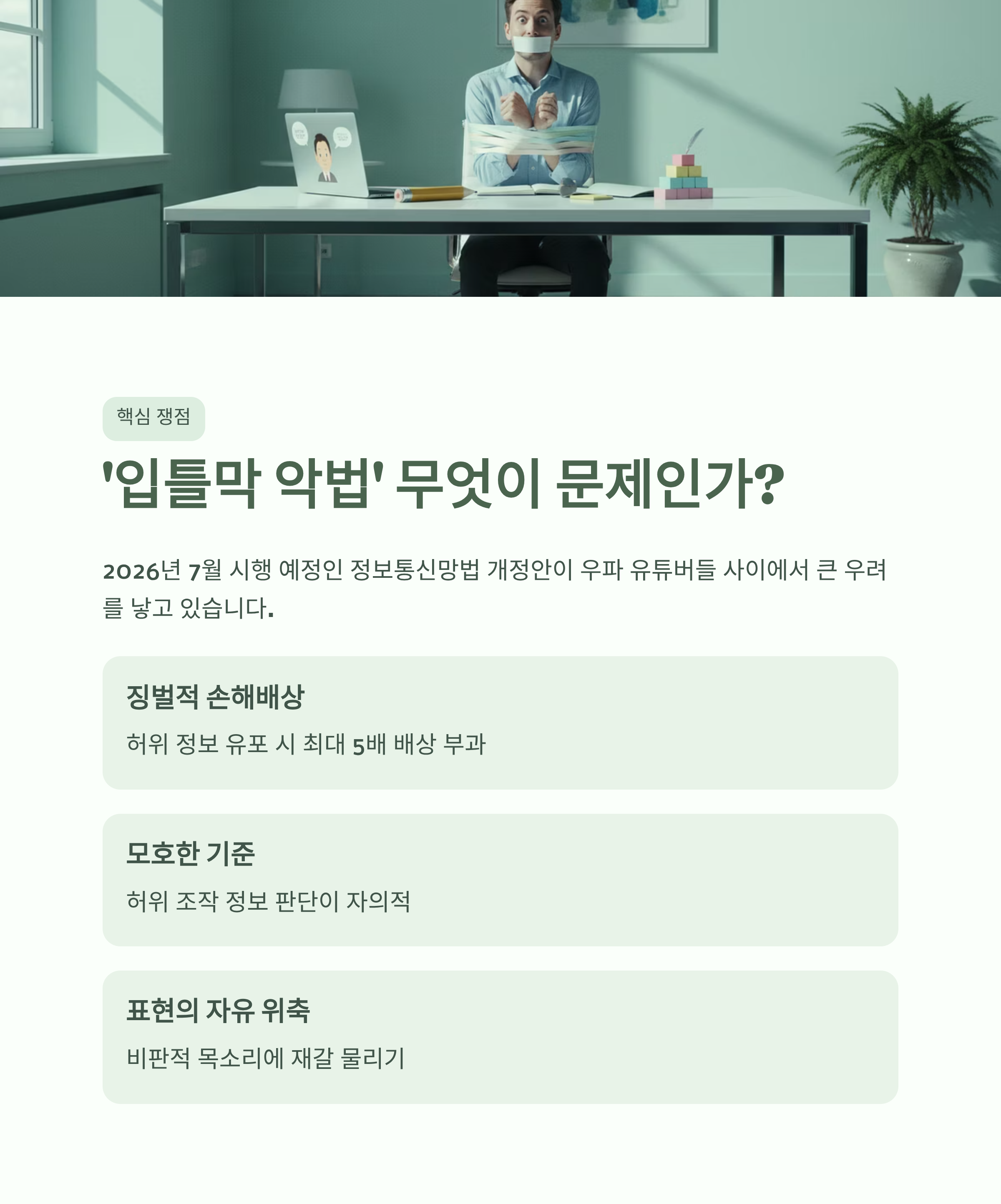 2026년 새해, 국내 우파 유튜버들 사이에서 큰 우려를 낳고 있는 사안이 있습니다. 바로 민주당 주도로 국회를 통과한 '정보통신망법 개정안'입니다. 이 개정안은 오는 7월 시행을 앞두고 있으며, 그 내용이 표현의 자유를 심각하게 위축시킬 수 있다는 점에서 '입틀막 악법'이라는 비판을 받고 있습니다. 개정안은 일정 규모 이상의 구독자와 게시물 수를 가진 정보 제공자를 대통령령으로 지정하고, 이들이 허위 조작 정보를 유통할 경우 최대 5배에 달하는 징벌적 손해배상을 부과할 수 있도록 규정합니다. 문제는 '허위 조작 정보'에 대한 판단 기준이 매우 모호하고 자의적일 수 있다는 점입니다. 정부나 특정 정치 세력에 비판적인 목소리를 내는 개인 유튜버의 의견 표명조차 '허위 사실 유포'로 규정되어 법적 처벌과 막대한 배상 책임으로 이어질 수 있다는 불안감이 확산되고 있습니다. 본문에서는 이 정보통신망법 개정안의 핵심적인 문제점들을 세 가지 측면에서 심층적으로 분석하고, 이것이 단순한 국내 문제를 넘어 한미 간의 통상 분쟁으로 비화될 가능성까지 짚어보고자 합니다.
