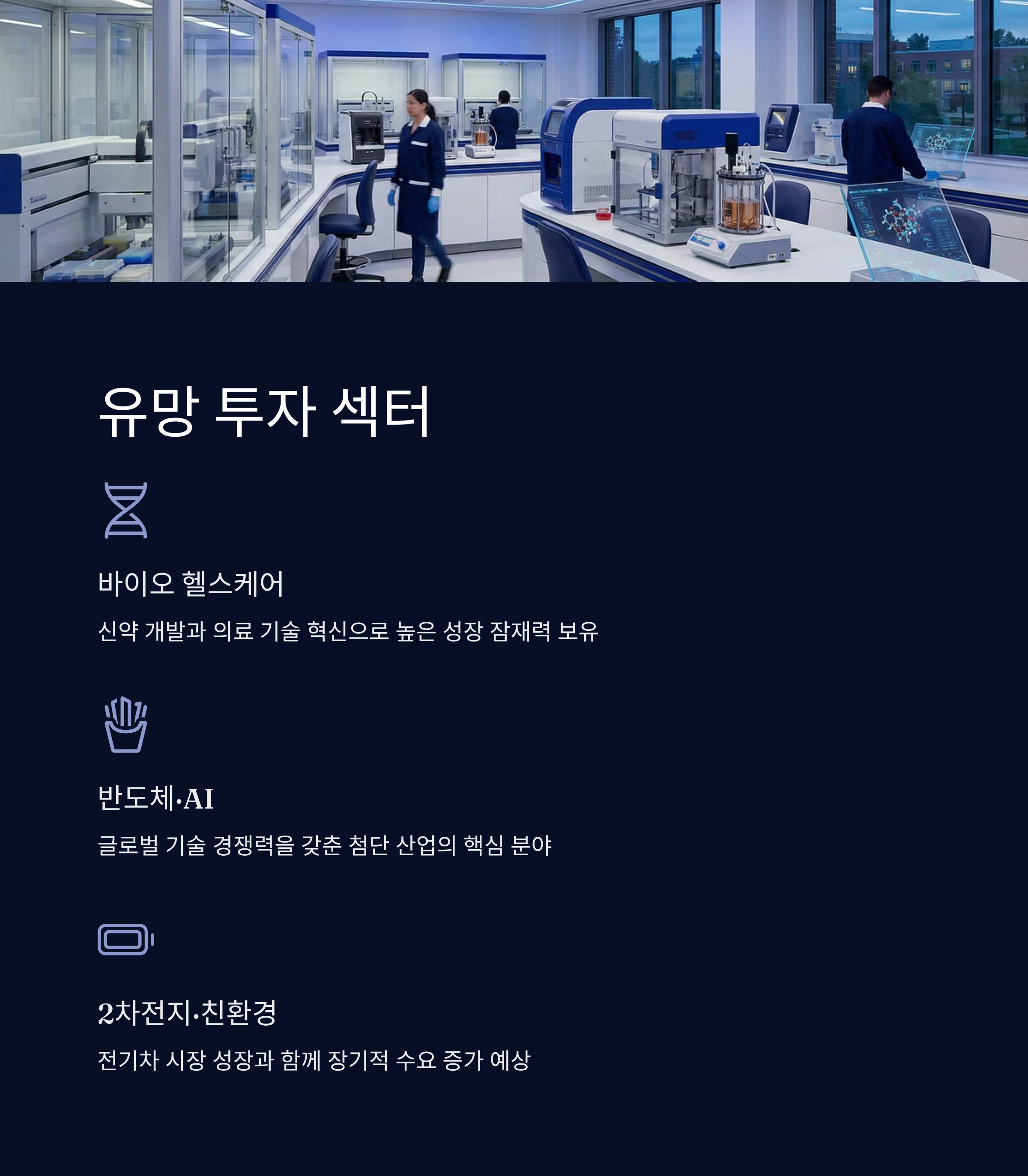 | A. 미래 성장 가능성이 높은 섹터, 예를 들어 바이오, 첨단 기술 기반의 산업이 유망합니다. 그만큼 세부적인 연구와 기업 평가가 뒷받침되어야 합니다. |