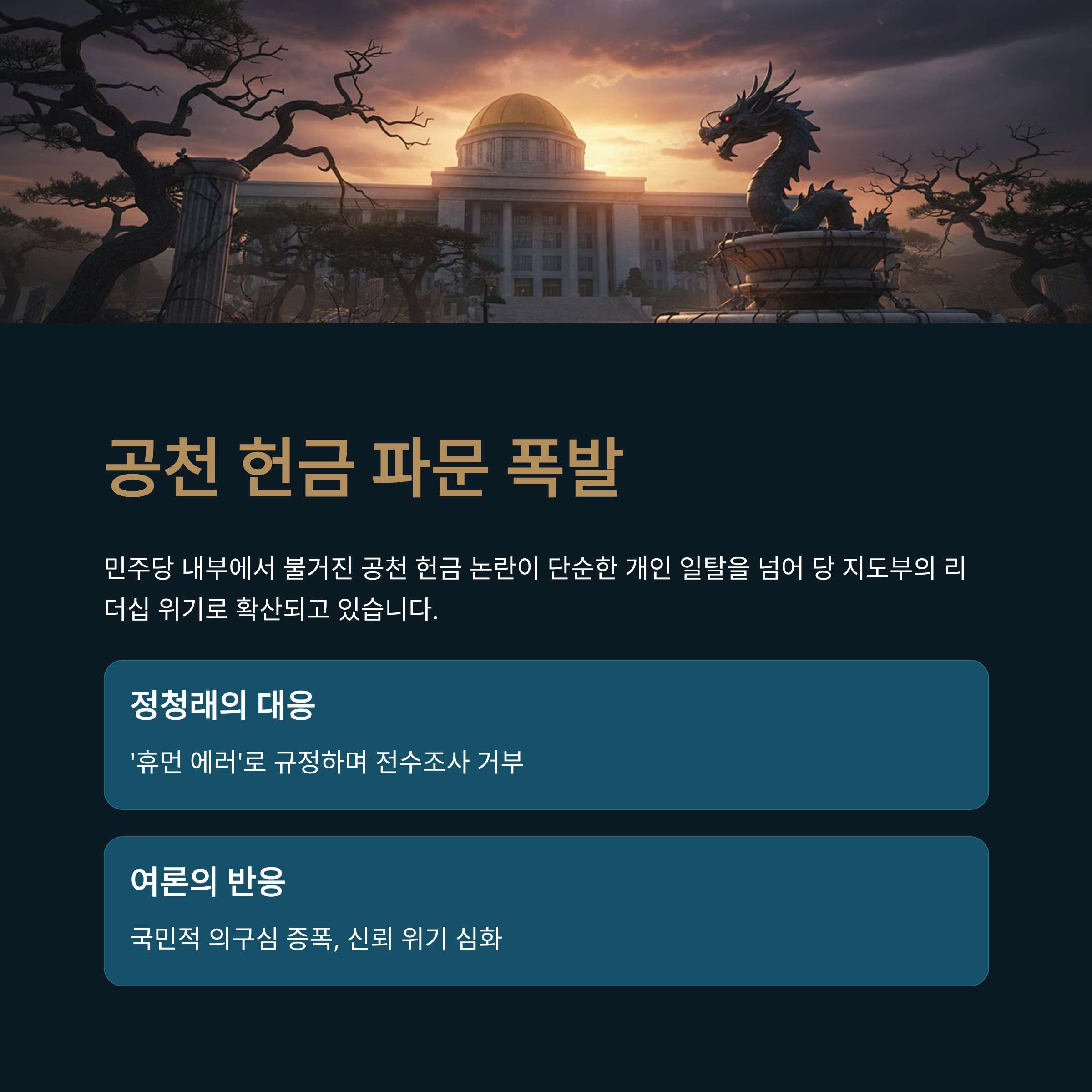 - 서론: 민주당 공천 헌금 파문과 정청래 대표의 미온적 대응이 불러온 의구심.