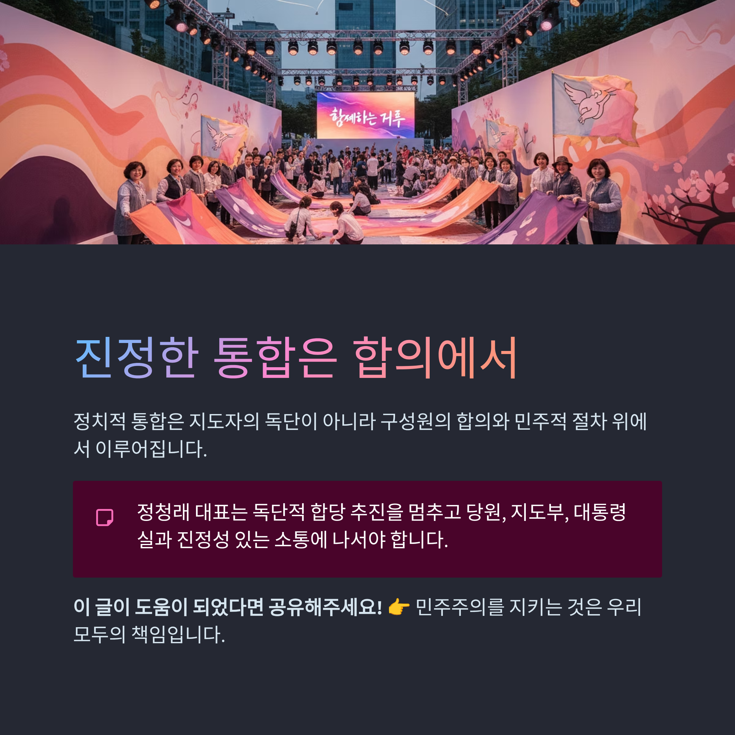 진정한 정치적 통합은 지도자의 독단이 아니라 구성원의 합의와 민주적 절차 위에서 이루어집니다. 정 대표는 지금이라도 독단적인 합당 추진을 멈추고 당원과 지도부, 그리고 대통령실과 진정성 있는 소통에 나서야 합니다. 개인의 권력욕이 당의 공적 시스템을 집어삼킬 때 그 정당의 미래는 암울할 수밖에 없음을 명심해야 할 것입니다.