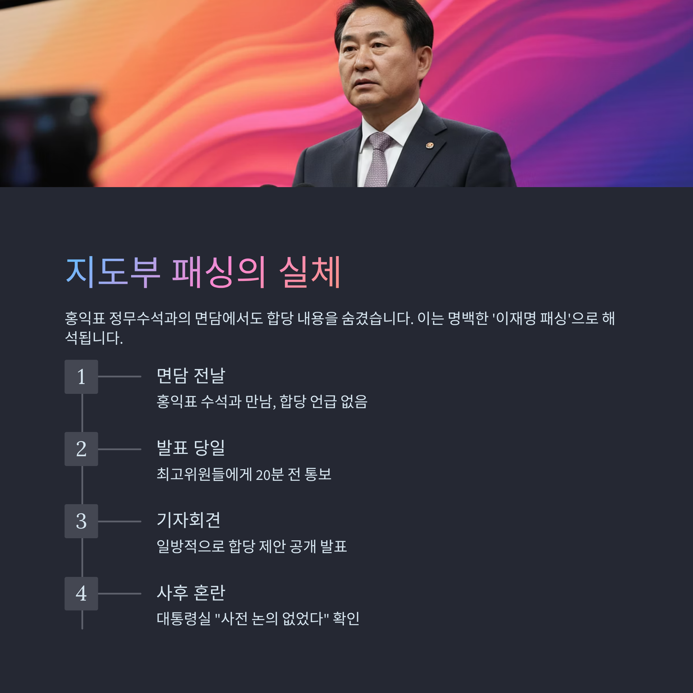 지도부 및 대통령실 패싱: 최고위원들은 기자회견 20분 전 통보받았고, 홍익표 정무수석은 면담에서도 관련 내용을 듣지 못해 '이재명 패싱 파문'이 현실화되었습니다.