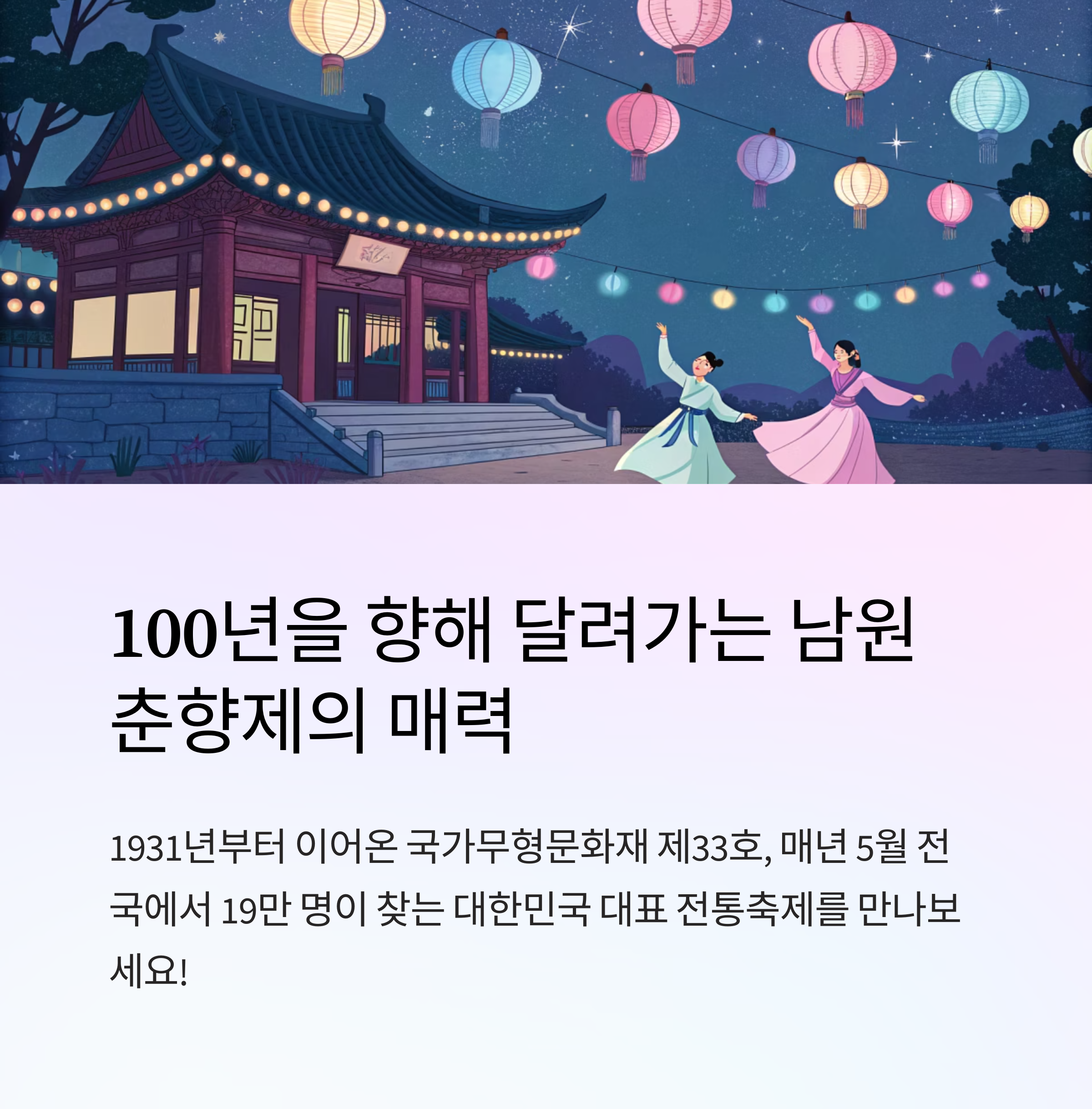 모두가 함께하는 대동축제의 중심에서 춘향제를 통해 새롭고 즐거운 경험을 만들어 보세요.