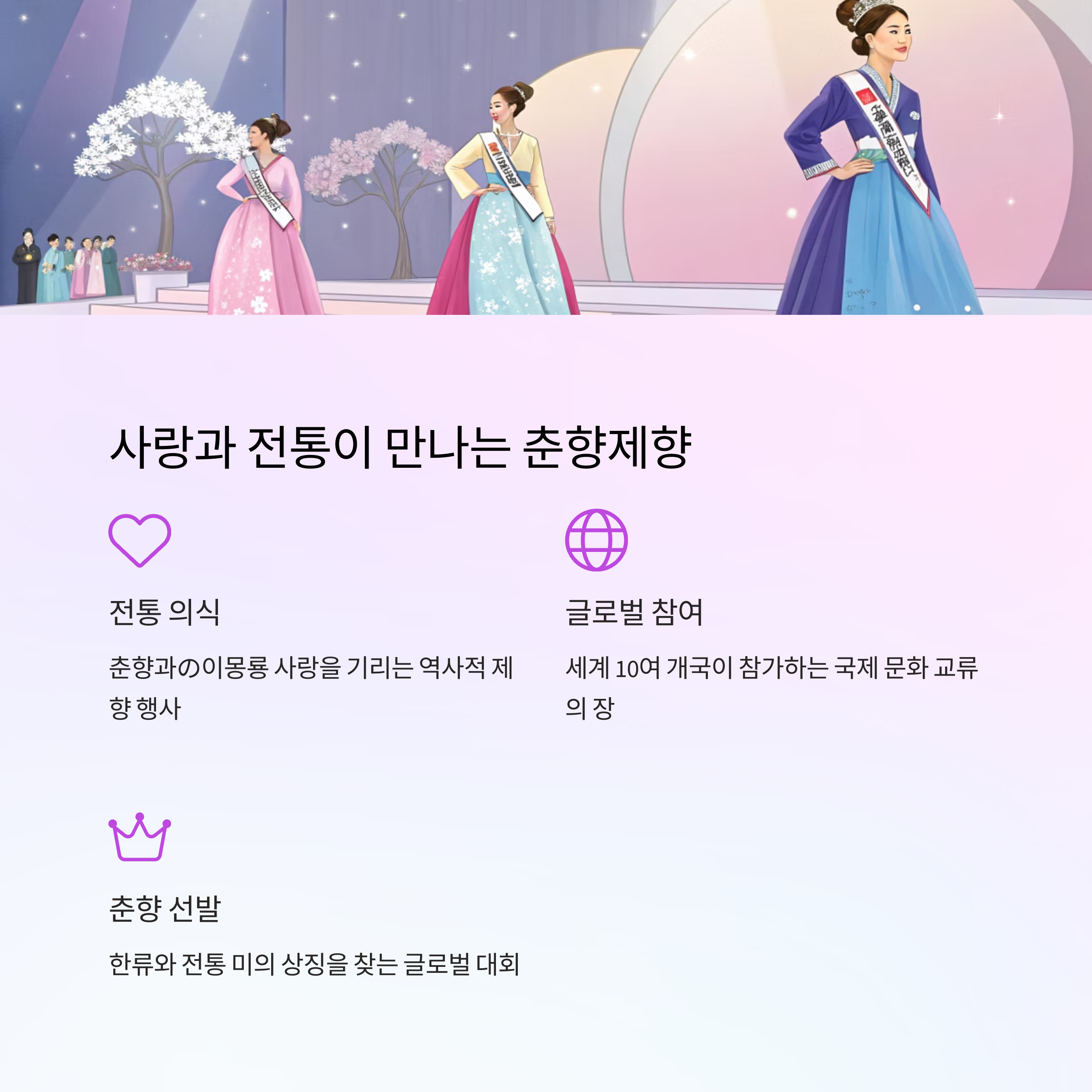 오늘은 춘향제의 아름다움과 이를 중심으로 한 다채로운 프로그램을 소개합니다.