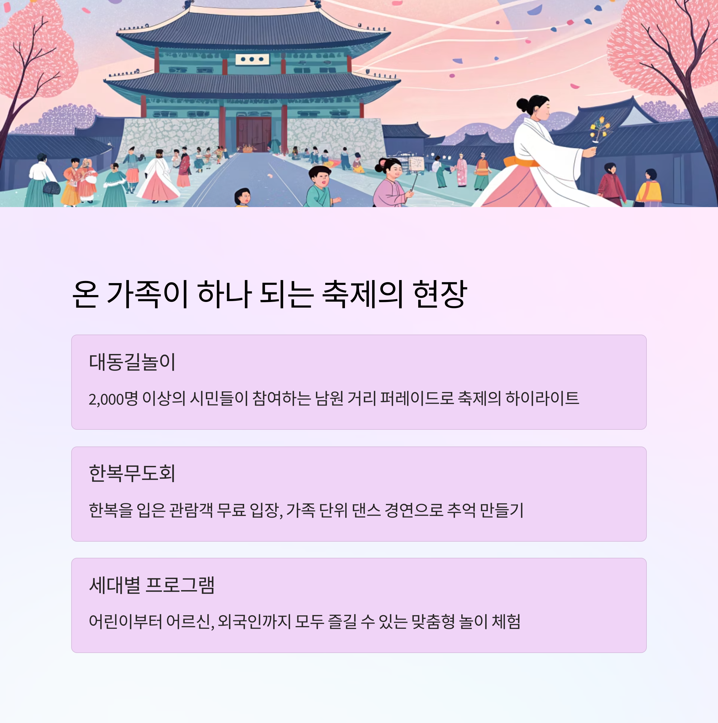 또한, 한복무도회와 전통 놀이 체험은 가족 중심의 참여형 프로그램으로써 높은 호응을 얻을 것으로 예상됩니다.