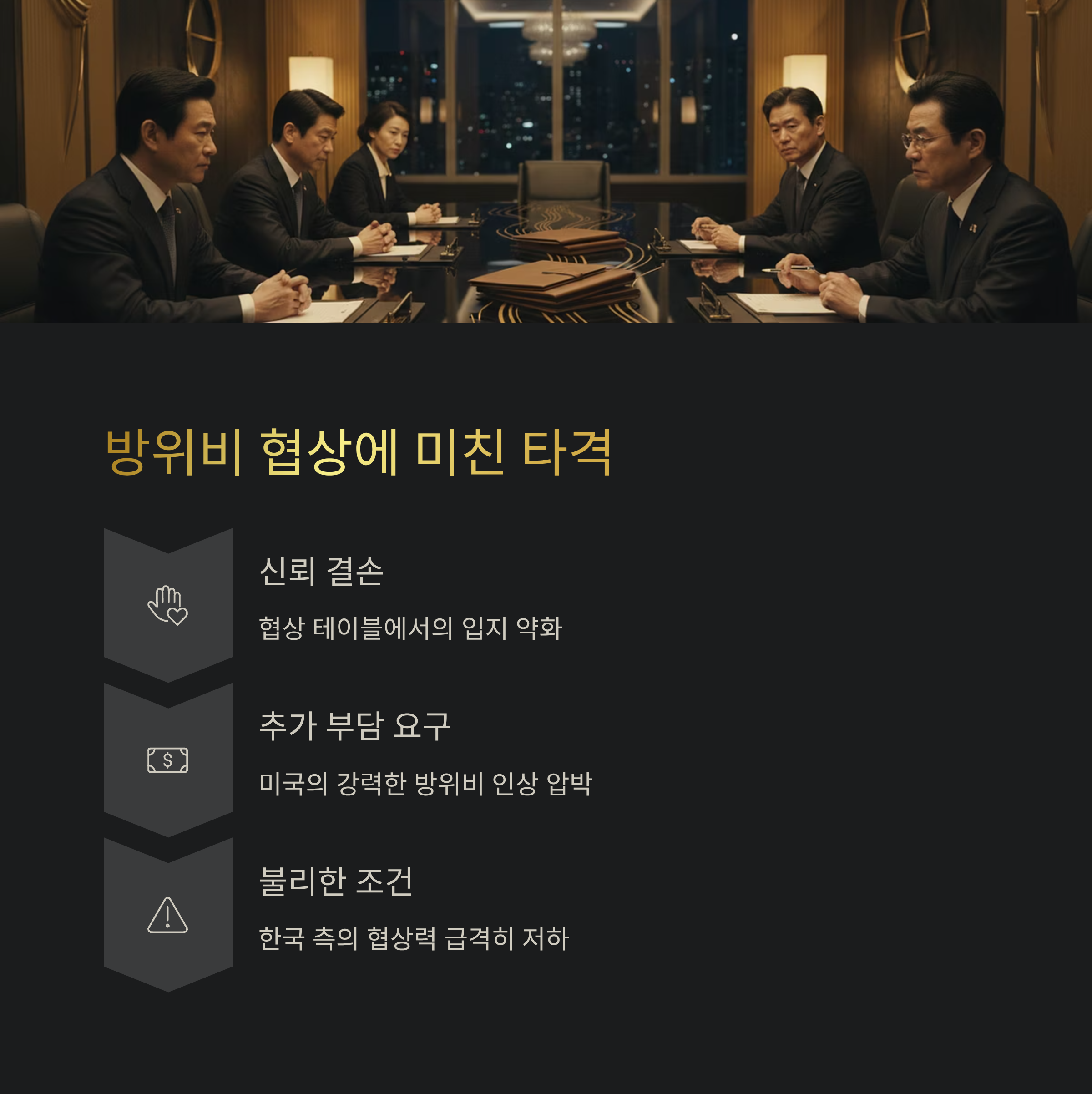 - 방위비 분담금 협상에서 미국 측의 강력한 압박으로 불리한 상황에 접어듦.