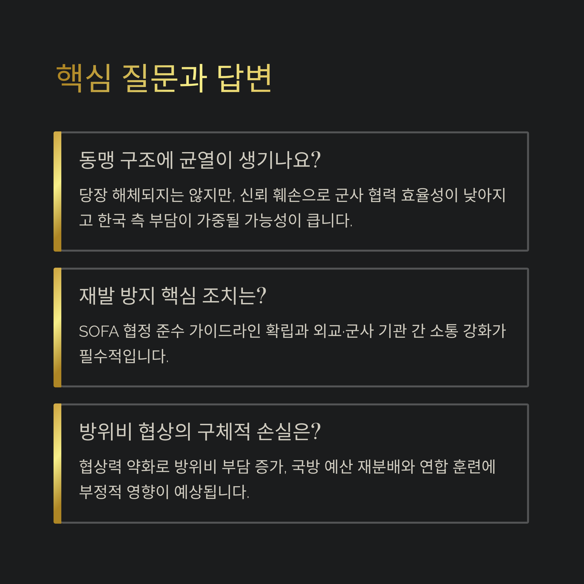 - 신뢰 훼손은 한미 연합 방위 체계 전반에 장기적 악영향 미침.