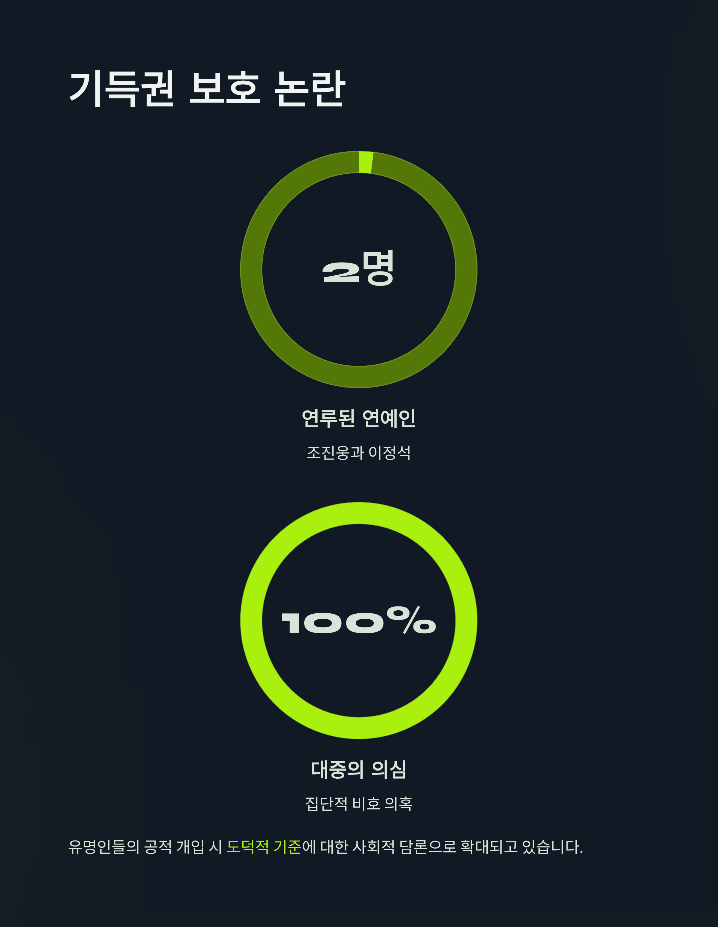 논란의 중심이 확산된 또 다른 계기는 가수 이정석이 조진웅을 공개적으로 옹호하며 불거진 그의 과거사입니다. 이정석은 "사람은 누구나 실수를 한다. 잘난 척하지 말라"는 식의 발언으로 조진웅을 두둔했지만, 그의 과거 도박과 횡령 전력이 재조명되며 대중의 분노를 키웠습니다. 특히, 이정석의 발언은 공론의 중심에서 내로남불의 대표적인 사례로 꼽히며 비판받았습니다. 이는 단순히 의도하지 않은 역풍에서 그치지 않고, 이정석의 진정성을 의심하는 분위기로 번지며, "기득권을 보호하기 위한 집단적 비호인가?"라는 또 다른 의문을 출발시켰습니다. 이 논란은 단순히 개인의 과거 행적을 넘어, 유명인들이 공적 개입을 할 때 어떤 도덕적 기준을 따라야 하는지에 대한 사회적 담론으로 이어지고 있습니다. 연예계 안팎에서는 공인의 사회적 책임이 개인의 자유와 어떤 균형을 이루어야 하는지에 대해 많은 사람들이 질문을 던지고 있습니다.