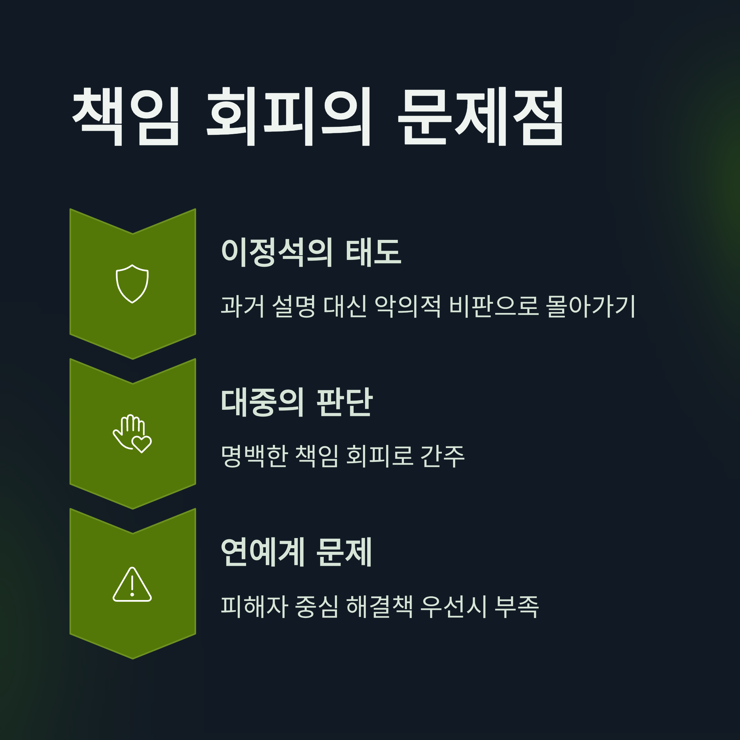 조진웅과 이정석의 논란이 가열됨에 따라 무엇보다도 중요한 논의는 피해자의 관점에서 이루어졌습니다. 조진웅 사건의 피해자는 당사자의 공개적인 사죄 없이 이 일에 대해 침묵을 강요당했다고 주장하며, 공인의 책임감 부족을 지적했습니다. 이로 인해 대중들 사이에서는 정치적 발언이나 자선 활동 같은 외부 행보를 모두 생략하더라도, 가장 기본적인 도덕적 책임은 피해자와 대중을 향한 솔직한 사과라는 사실이 강조되고 있습니다. 이정석의 경우 역시 피해자 중심의 관점에서 발언이 부족했다는 비판이 많습니다. 그는 자신의 과거를 설명하기보다 조진웅의 행동을 이유 없는 악의적 비판으로 돌리려 했으며, 대중은 이를 "책임 회피"로 간주했습니다. 이는 공인 사회에서의 책임 의식 부족과 관련된 논쟁으로 이어졌으며, 현재까지 연예계를 비롯한 공적 인물들이 피해자 중심의 해결책을 우선시하지 않는다는 지적이 계속되고 있습니다.