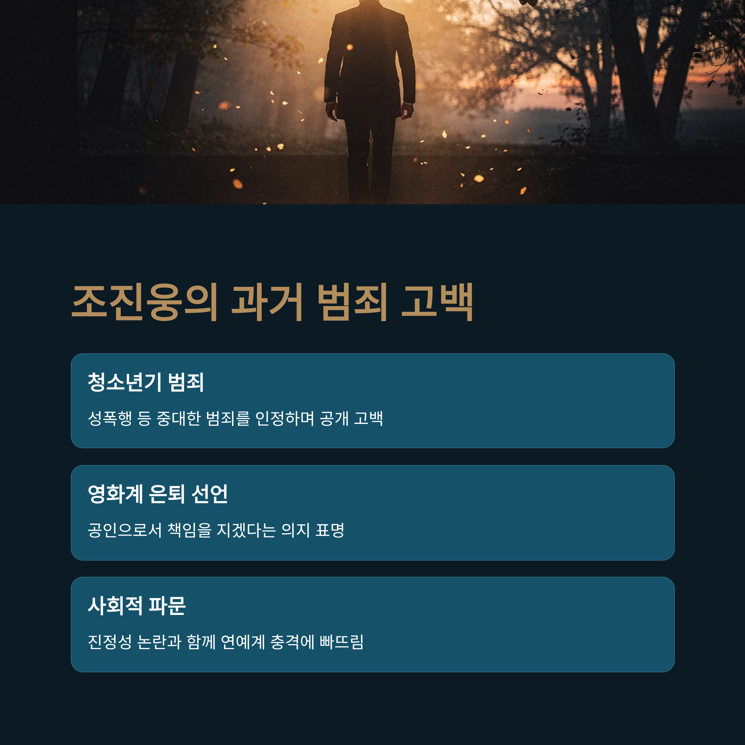 - 조진웅은 청소년기, 성폭행 등 중대한 범죄를 인정하며 영화계 은퇴를 선언했습니다.