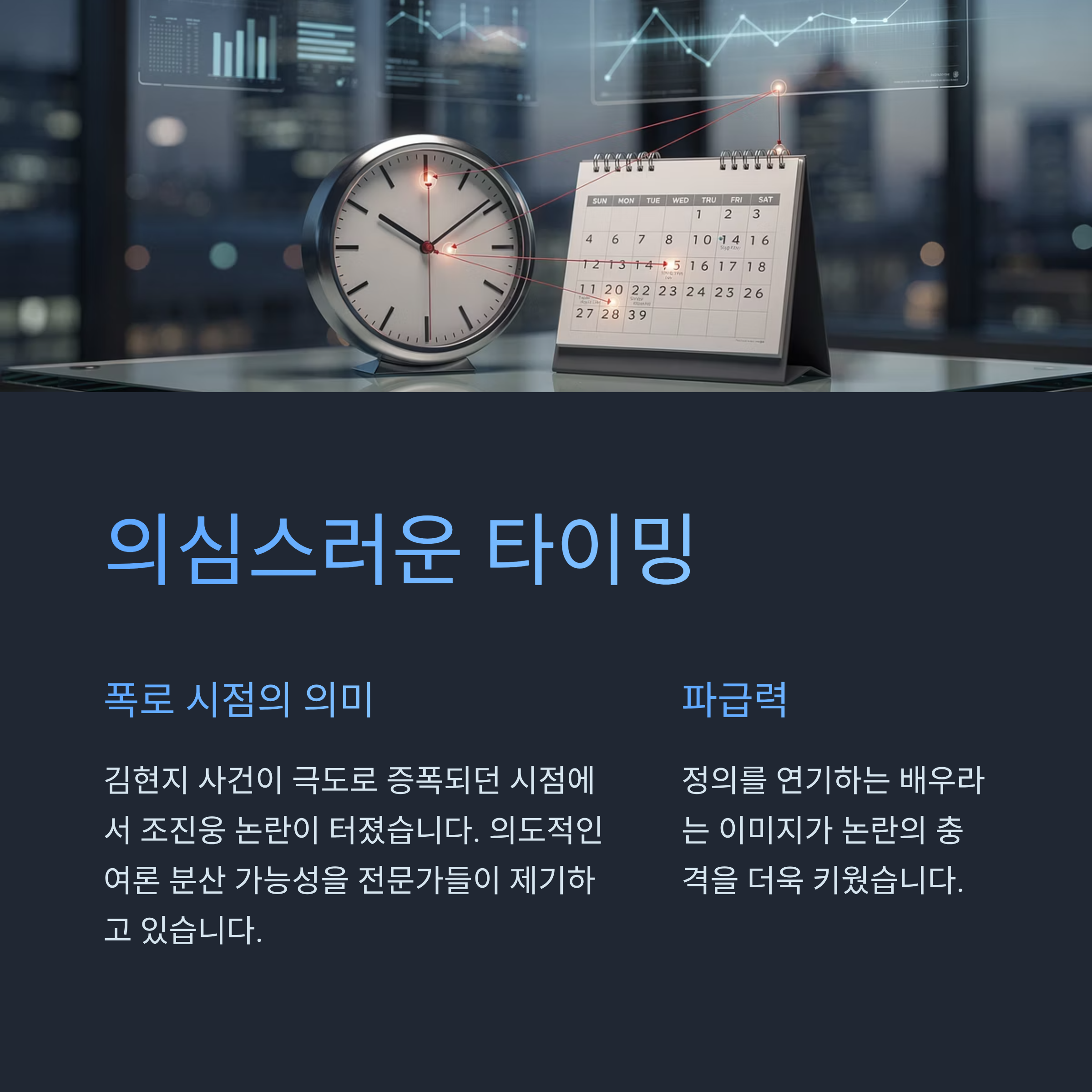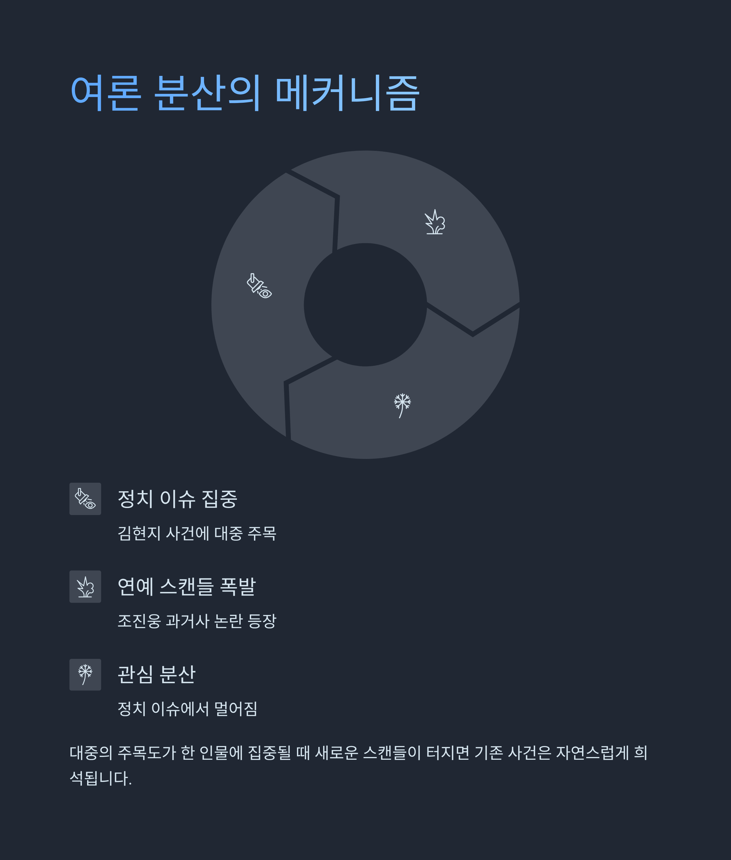 김현지 사건은 주요 정치적 인물을 둘러싼 부패 의혹으로, 언론 및 시민사회를 통해 연일 논의되고 있었습니다. 하지만 조진웅의 과거 논란이 커지면서 이슈는 급격히 무색해졌습니다. 대중의 관심과 분노는 개인적 사안으로 쏠렸고, 정치적 공방은 대중적 관심에서 멀어졌습니다. 연예계 사건이 정치적으로 활용되었는지 단정할 수는 없으나, 시점과 사건 간의 연속성은 많은 질문을 낳고 있습니다. 또한, 연예계 사건이 미디어 소비층의 감정적 공감을 더 많이 이끌어내기 때문에, 비교적 가볍다는 점에서 정치적 이슈보다 빠르게 전파되기 쉽습니다.