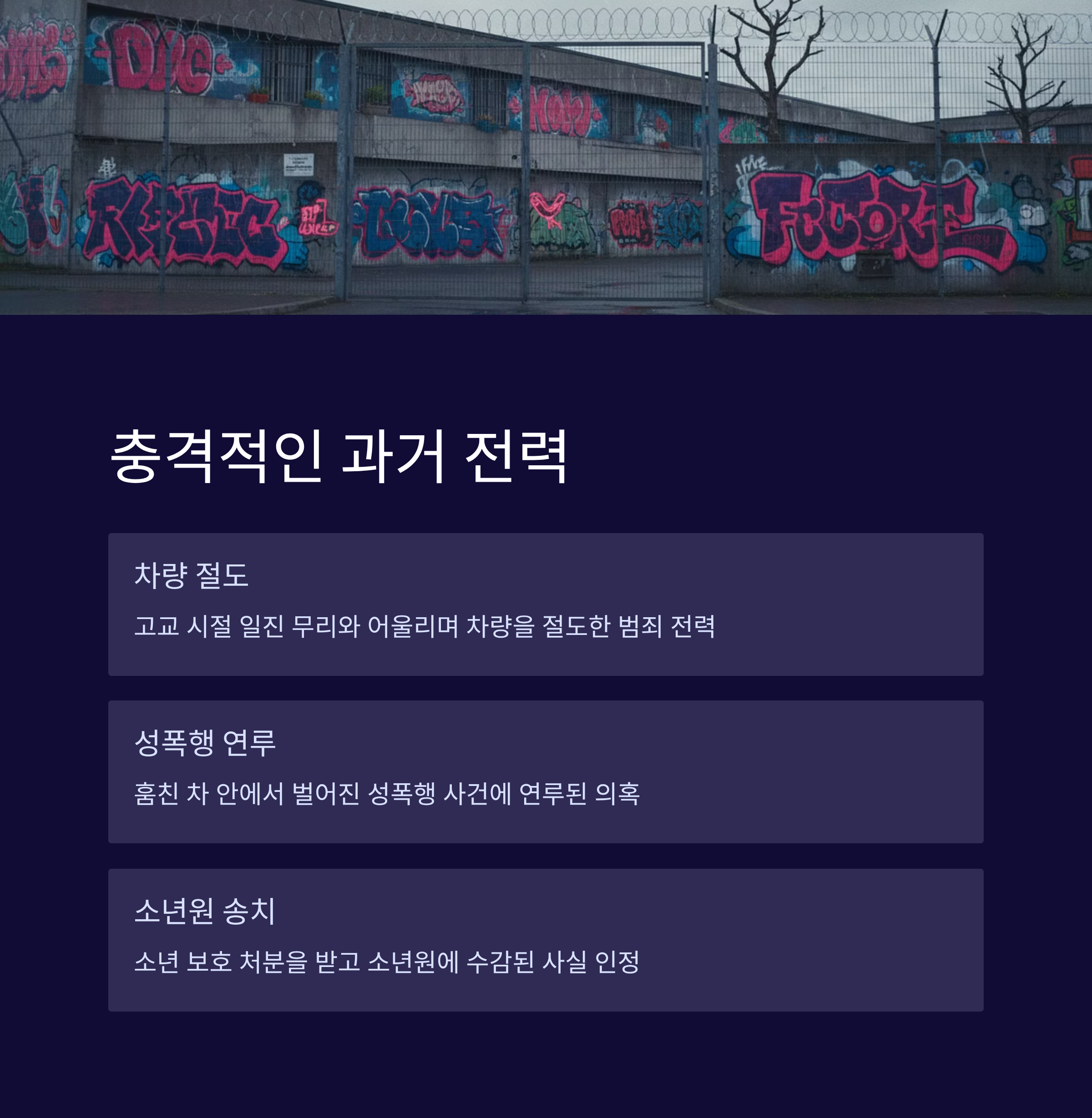 보도에 따르면 그는 고등학생 시절 일진 무리와 어울리며 차량을 절도했고, 그 훔친 차 안에서 벌어진 성폭행 사건에 연루되어 소년 보호 처분을 받았습니다.