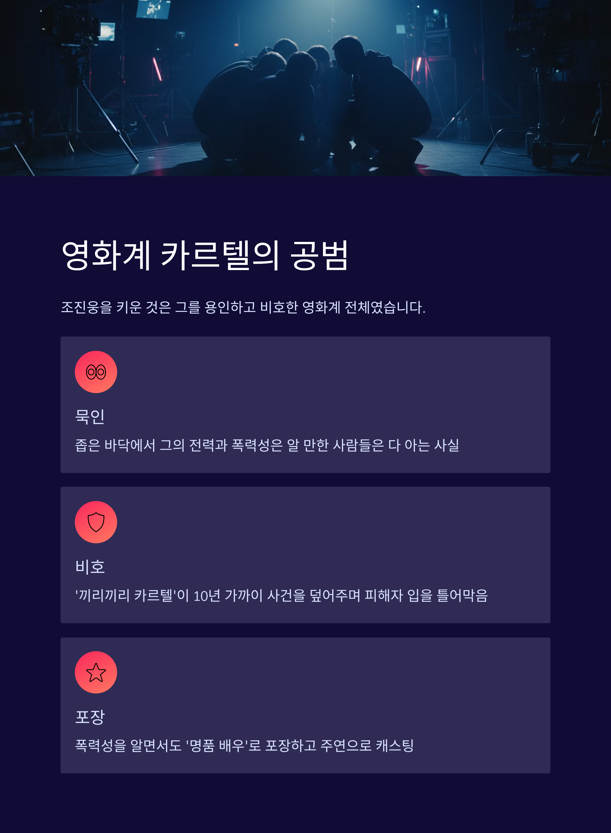이번 사태는 조진웅 개인의 문제를 넘어, 그를 용인하고 키워낸 대한민국 영화계의 민낯을 드러냈습니다.