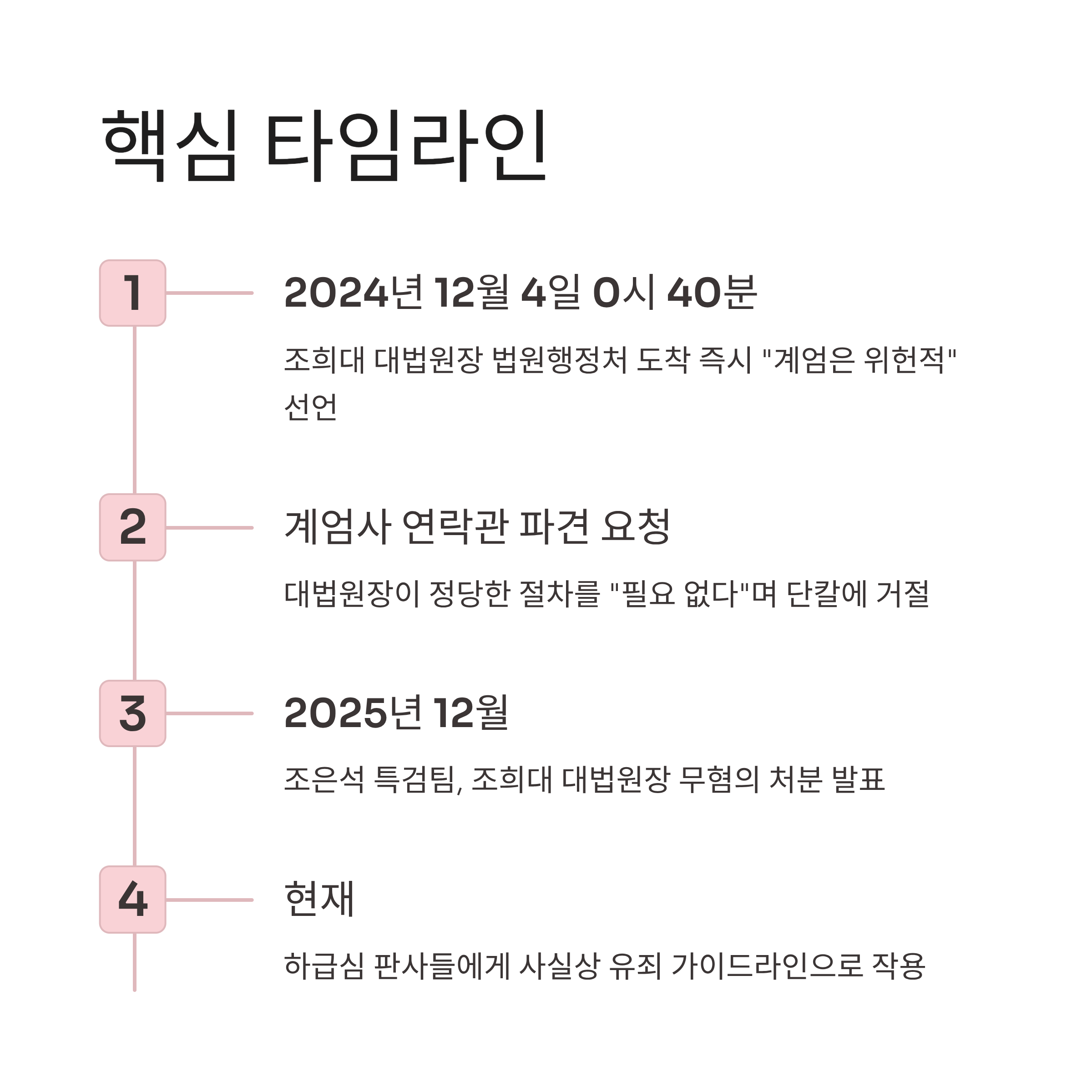 즉각적인 위헌 선언: 조희대 대법원장은 2024년 12월 4일 0시 40분경, 법원행정처 도착 즉시 "계엄은 위헌적"이라는 취지의 발언을 함. 이는 법리적 검토 없는 성급한 단정임.