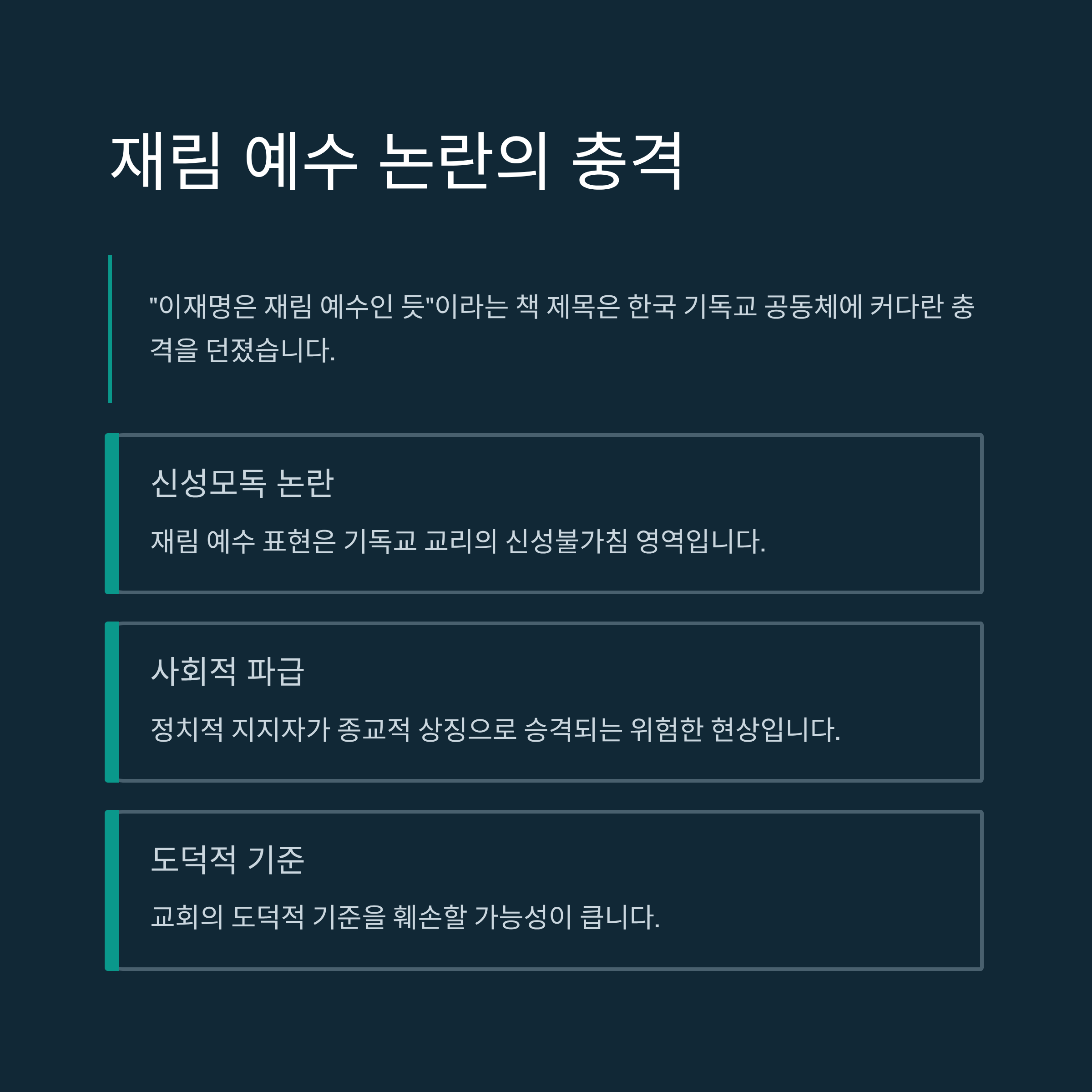 '이재명은 재림 예수인 듯'이라는 책 제목은 단순한 비유나 상징 이상의 충격을 던졌습니다. 이는 한국 기독교 공동체에 커다란 논란을 불러일으켰을 뿐만 아니라, 정치적 지지자가 종교적 상징으로 승격되는 현상이 어떻게 사회적 불안을 초래할 수 있는지를 보여주는 사례가 됩니다. 책의 내용에 대하여 많은 이들은 이것이 단순한 찬사 수준을 넘어선 신성모독이라 주장하며, 신앙적 기준에서 이를 규탄했습니다. 재림 예수라는 표현은 기독교 교리에서 택할 수 없는 신성불가침의 영역이며, 이를 인간에게 적용하는 행위는 교회의 도덕적 기준을 훼손할 가능성이 큽니다. 이 논란은 크리스천들에게 신앙이 가지는 민감한 경계선을 다시 한번 인식하게 만들었습니다.