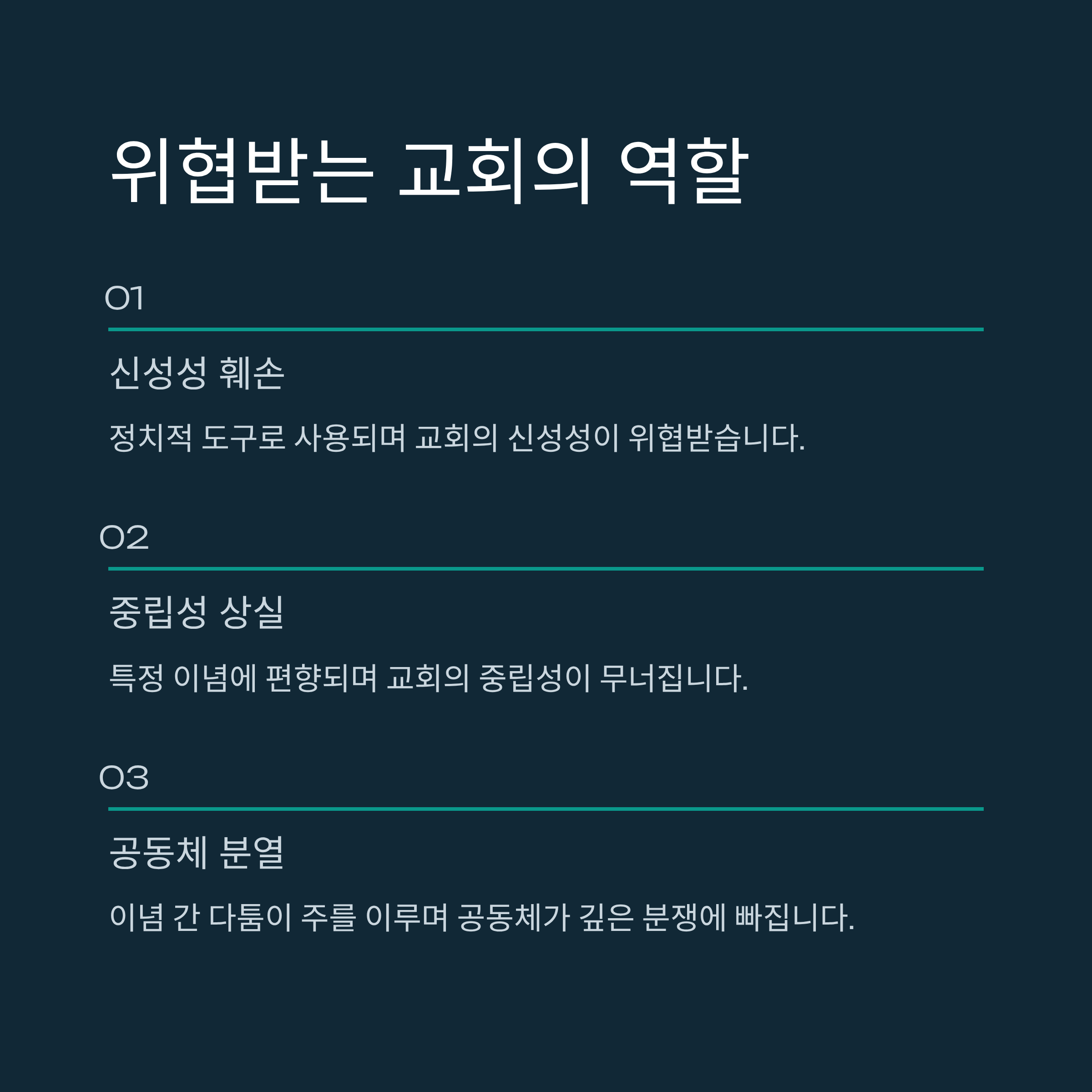 | A. 정치적 이념이 교회로 스며들면 교인들 간의 갈등과 분열을 초래할 가능성이 큽니다. 이는 예배의 본질과 공동체의 평화를 해치는 결과를 낳을 수 있습니다. |