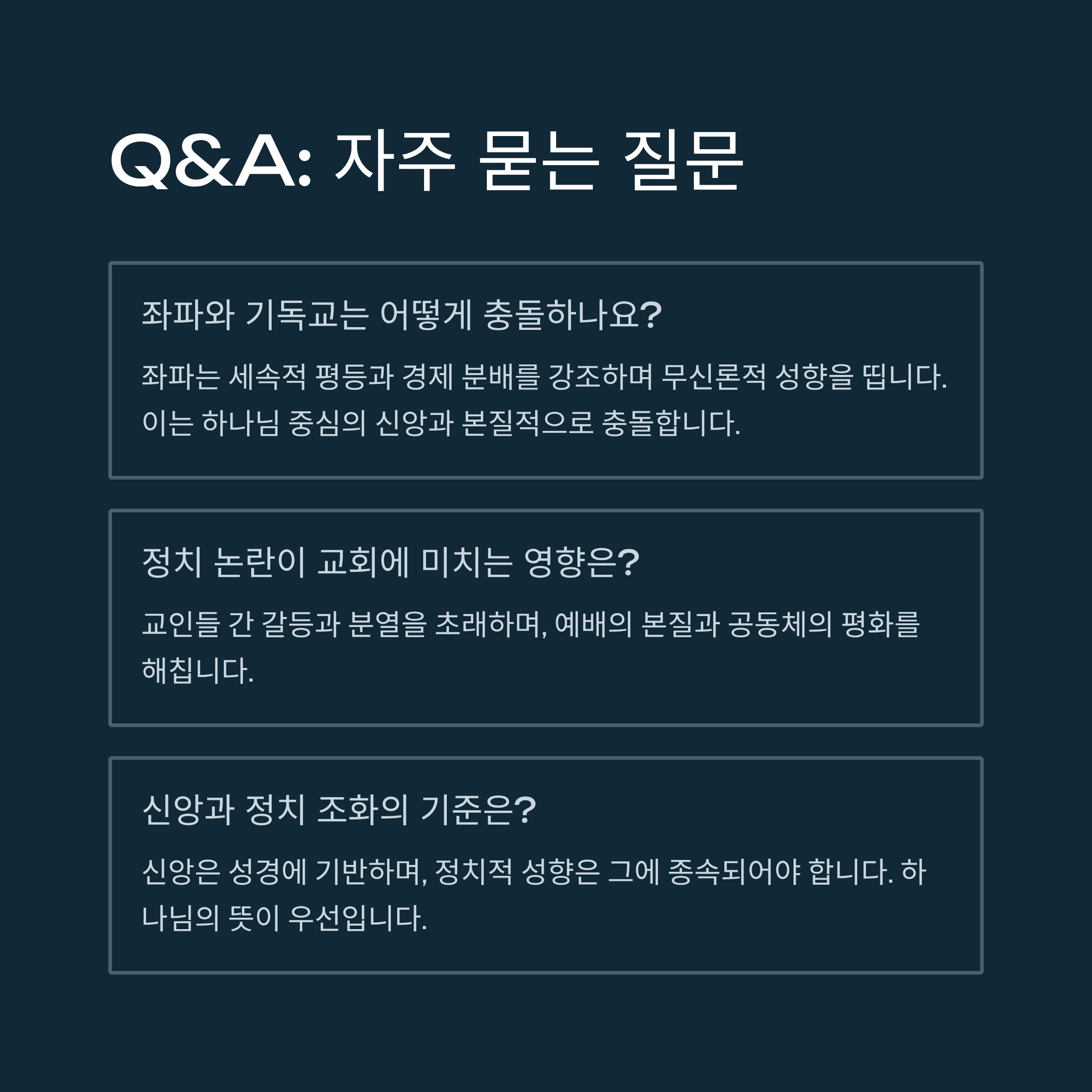 | A. 좌파는 주로 세속적 평등과 경제 분배를 강조하며 종종 무신론적 성향을 띕니다. 이는 하나님 중심의 기독교 신앙과 본질적으로 충돌할 가능성이 높습니다. |