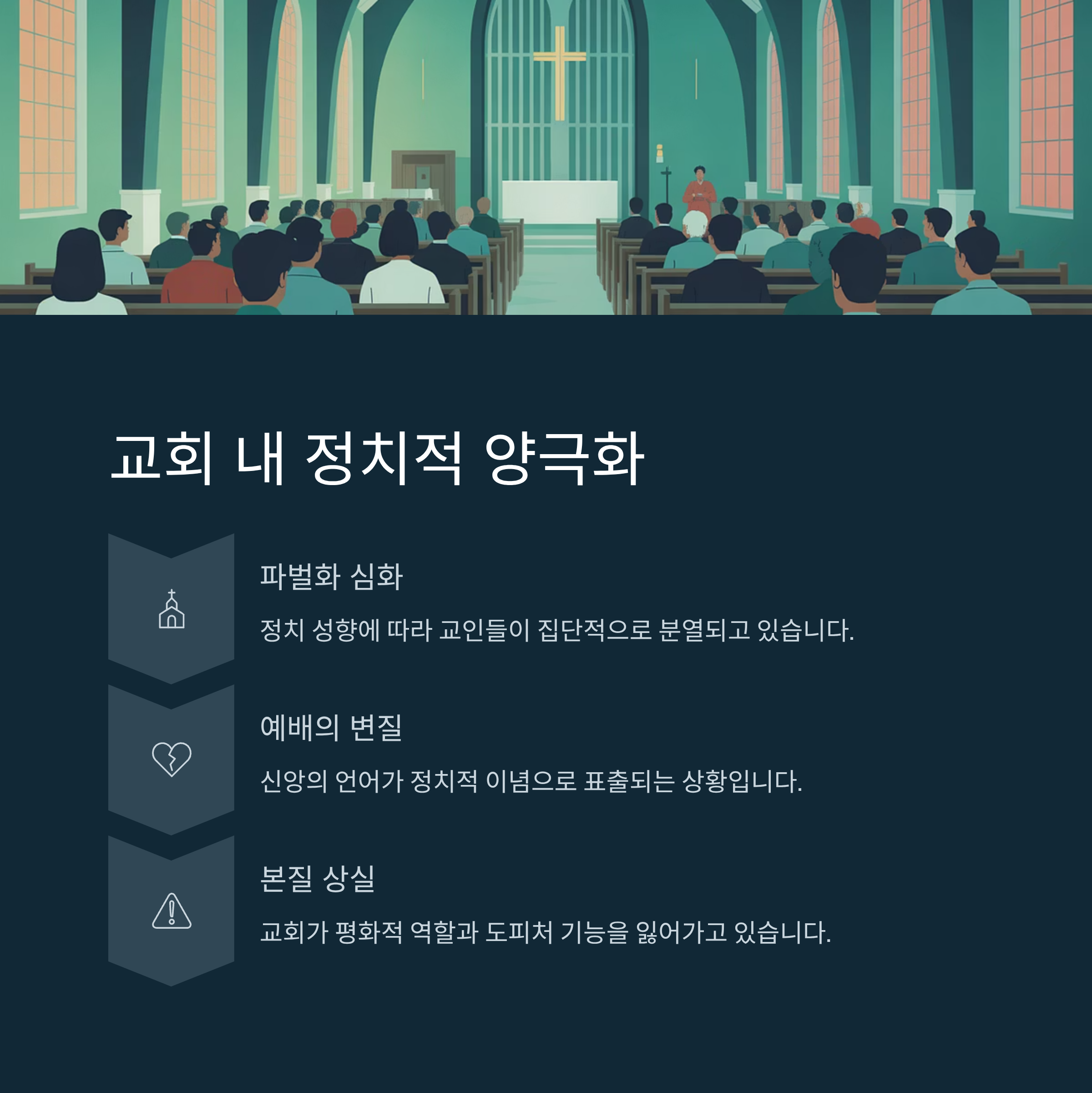 최근 한국 교회 내에서 정치적 파벌화와 분열이 점차 심화되고 있습니다. 교인들이 특정 정치 성향에 따라 집단적으로 나뉘며, 심지어 예배와 소그룹을 통해도 이러한 정치적 경계가 명백히 드러나는 경우도 자주 목격됩니다. 정치적 이념이 신앙의 언어로 표출되는 이 같은 상황에서 교리는 희석되고 신앙의 본질 대신 이념 간의 다툼이 주를 이루는 부정적인 결과를 초래합니다. 더욱이 특정 정치적 이념과 인물을 성경적 진리와 동일시하려는 시도는, 신앙적 공동체를 깊은 분쟁의 구렁텅이로 몰아넣습니다. 이는 교회가 가진 평화적 역할과 도피처로서의 본래 기능 상실로 이어질 우려가 있습니다.