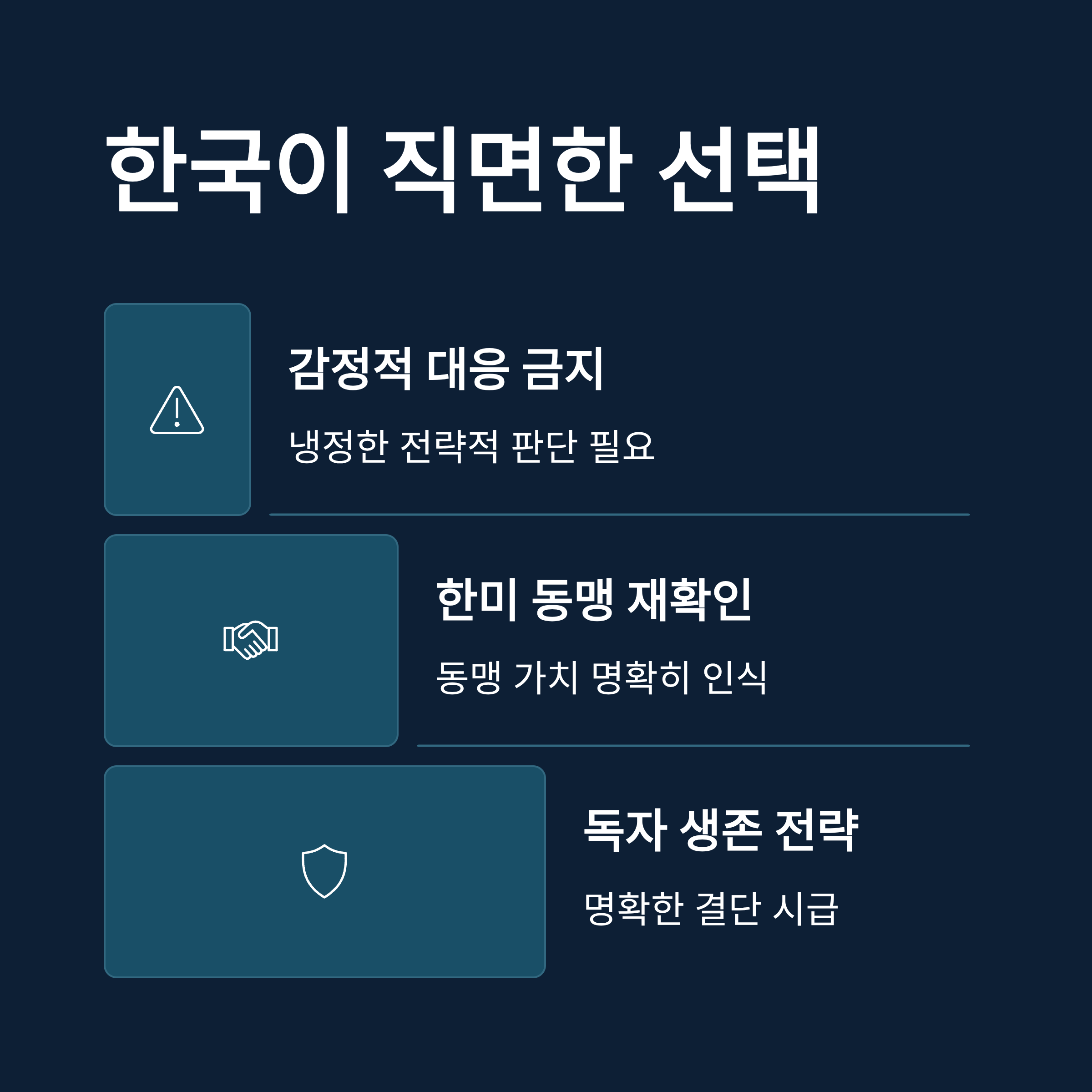 이번 사건은 과거 한국 외교의 핵심이었던 '안보는 미국, 경제는 중국(안미경중)' 전략이 더 이상 유효하지 않음을 증명합니다. 미국은 한국에 확실한 줄 서기를 강요하고 있으며, 이를 거부할 경우 '주한미군 감축'이나 '철수' 카드를 꺼낼 가능성도 배제할 수 없습니다.