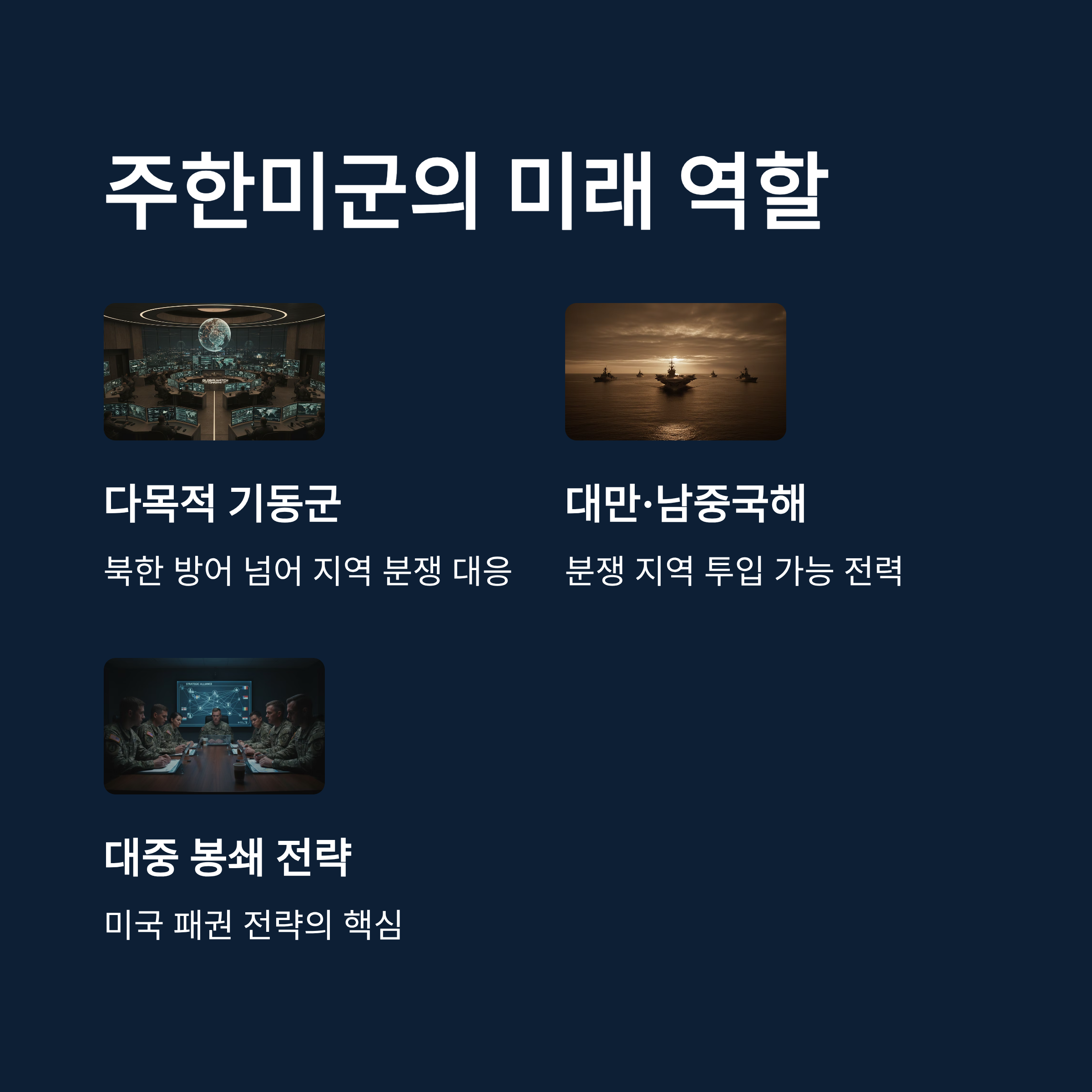 | A. 주한미군은 북한 방어라는 고정된 역할에서 벗어나, 대만 해협이나 남중국해 등 분쟁 지역에 투입될 수 있는 다목적 기동군으로 변화하고 있습니다. 이번 훈련은 주한미군이 미국의 대중국 봉쇄 전략의 핵심 전력으로 운용될 것임을 보여주는 결정적 사례입니다. |