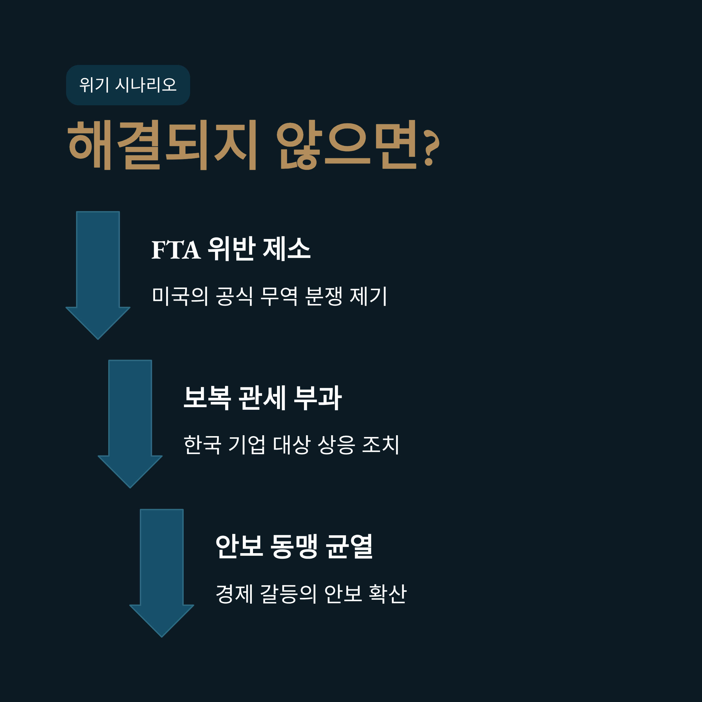 | A: 미국이 한미 FTA 위반을 공식 제소하며 무역 분쟁으로 번질 수 있습니다. 더 나아가 미국이 한국 기업에 대한 보복 관세 등 상응하는 조치를 취할 수 있으며, 이러한 경제 갈등이 깊어지면 한미 안보 동맹 관계에도 악영향을 미칠 수 있습니다. |