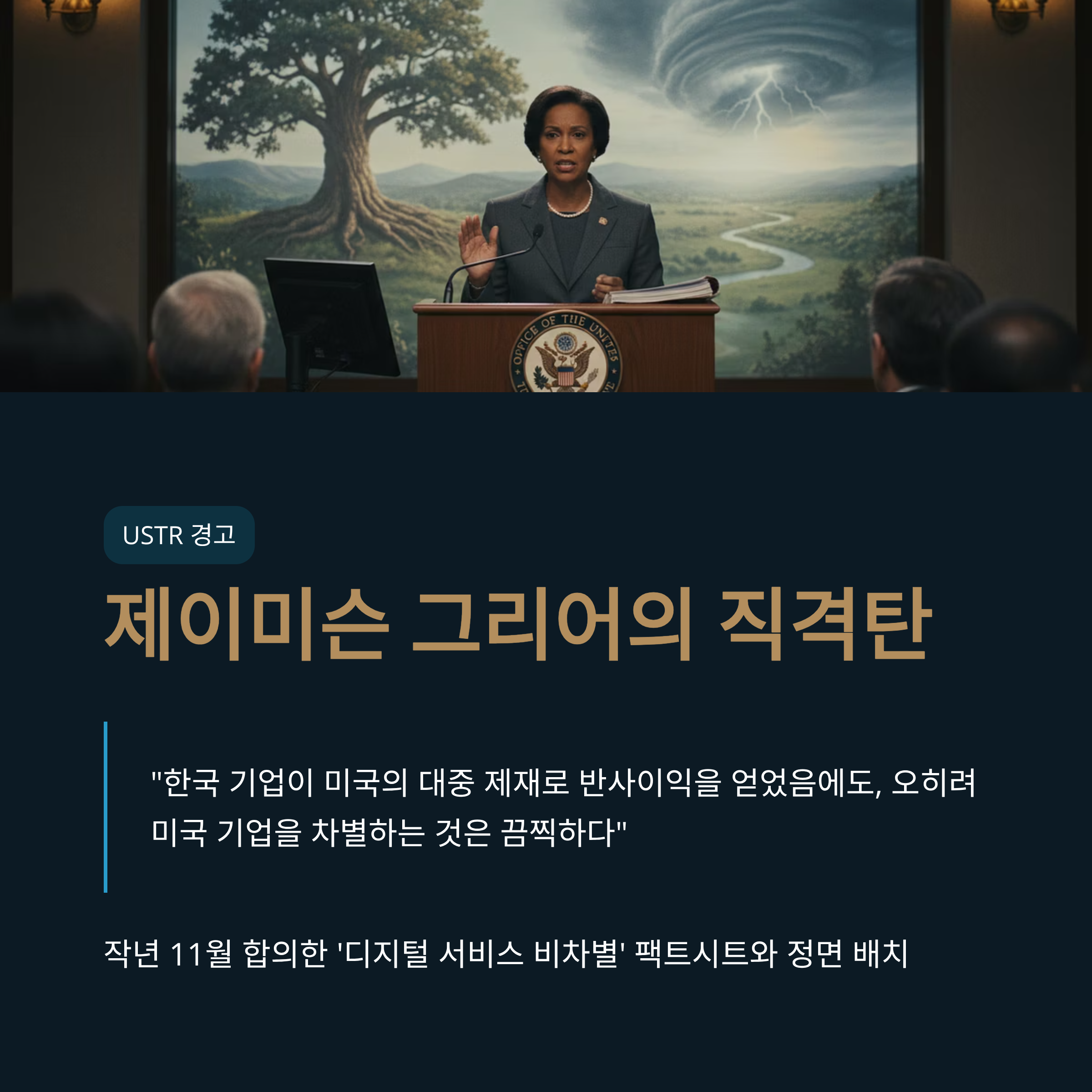 제이미슨 그리어 전 USTR 대표는 인터뷰를 통해 "한국 기업이 미국의 대중 제재로 반사이익을 얻었음에도 불구하고, 오히려 미국 기업을 차별하는 규제를 도입하는 것은 끔찍하다"며 노골적인 불쾌감을 드러냈습니다. 이러한 발언은 작년 11월 한미가 합의한 '디지털 서비스 비차별' 팩트시트 내용과도 정면으로 배치되는 한국의 정책 방향에 대한 실망감을 반영합니다. 미국은 1차 경고에도 한국의 태도 변화가 없을 경우, FTA 위반을 공식 제기하고 상응하는 보복 조치에 나설 것임을 암시하고 있습니다.