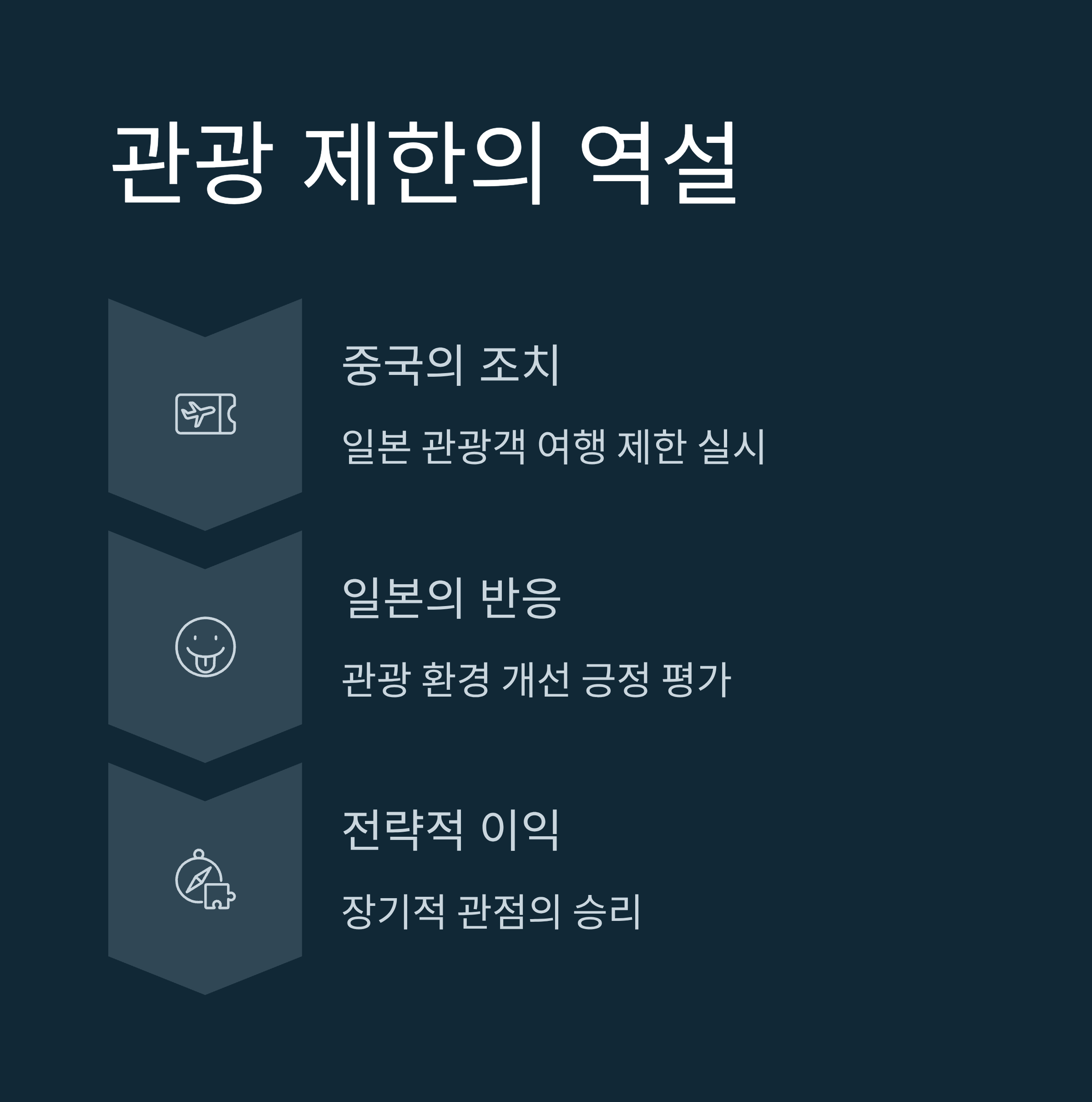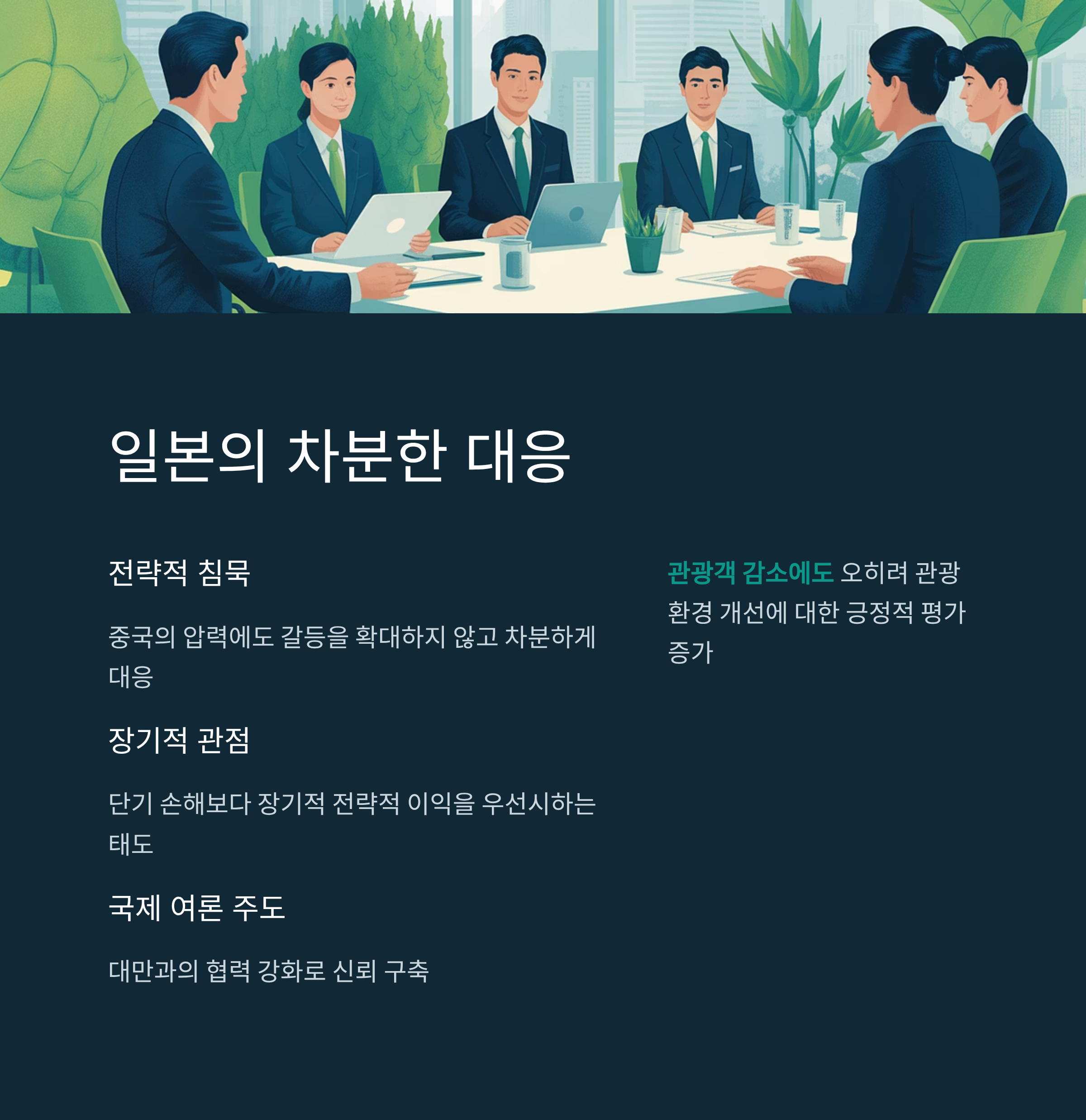 | A. 일본은 갈등을 확대하지 않고 차분하게 대응하며, 국제 여론 형성에 초점을 맞췄습니다. 관광객 감소에도 긍정적으로 받아들이는 모습을 보였습니다. |