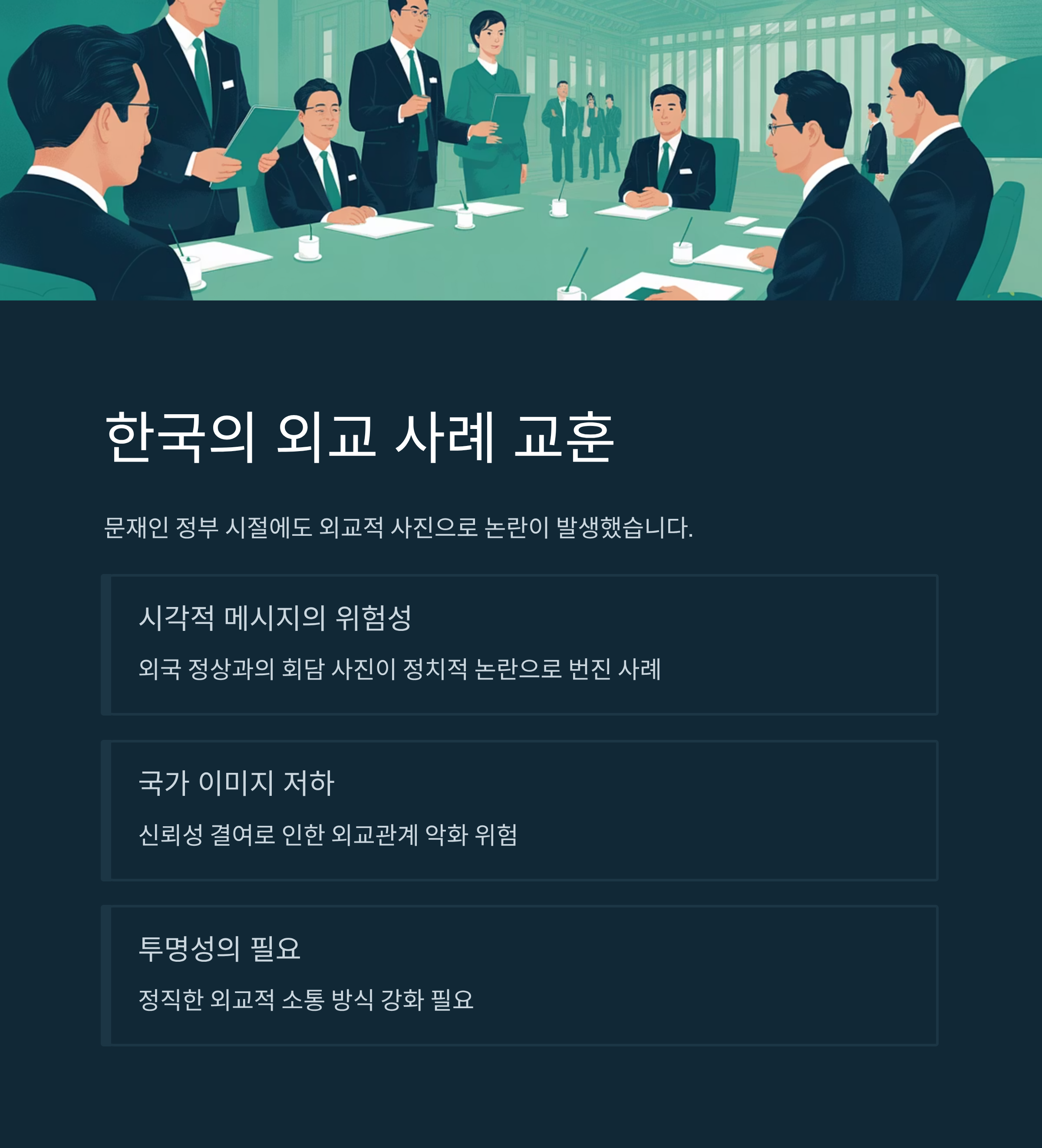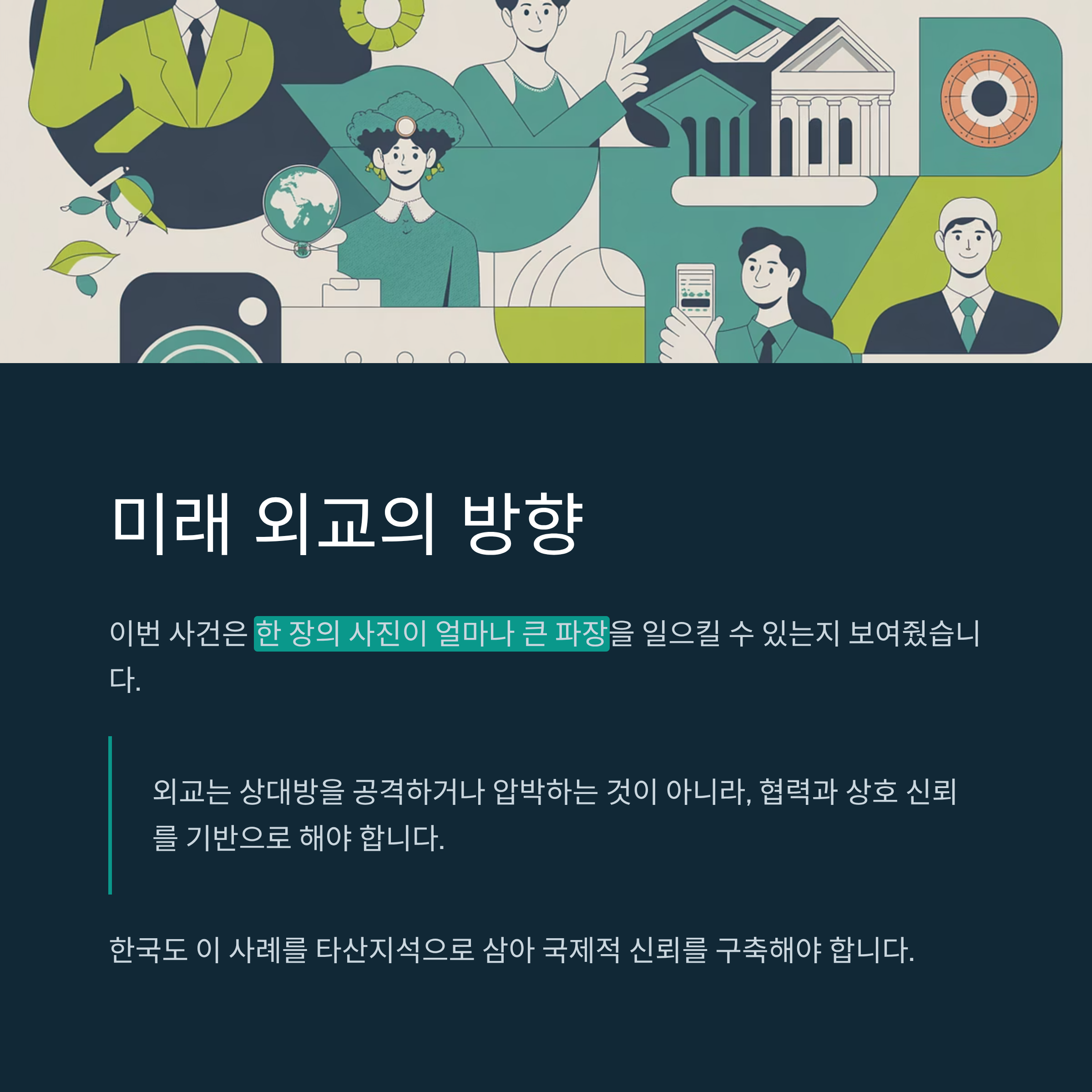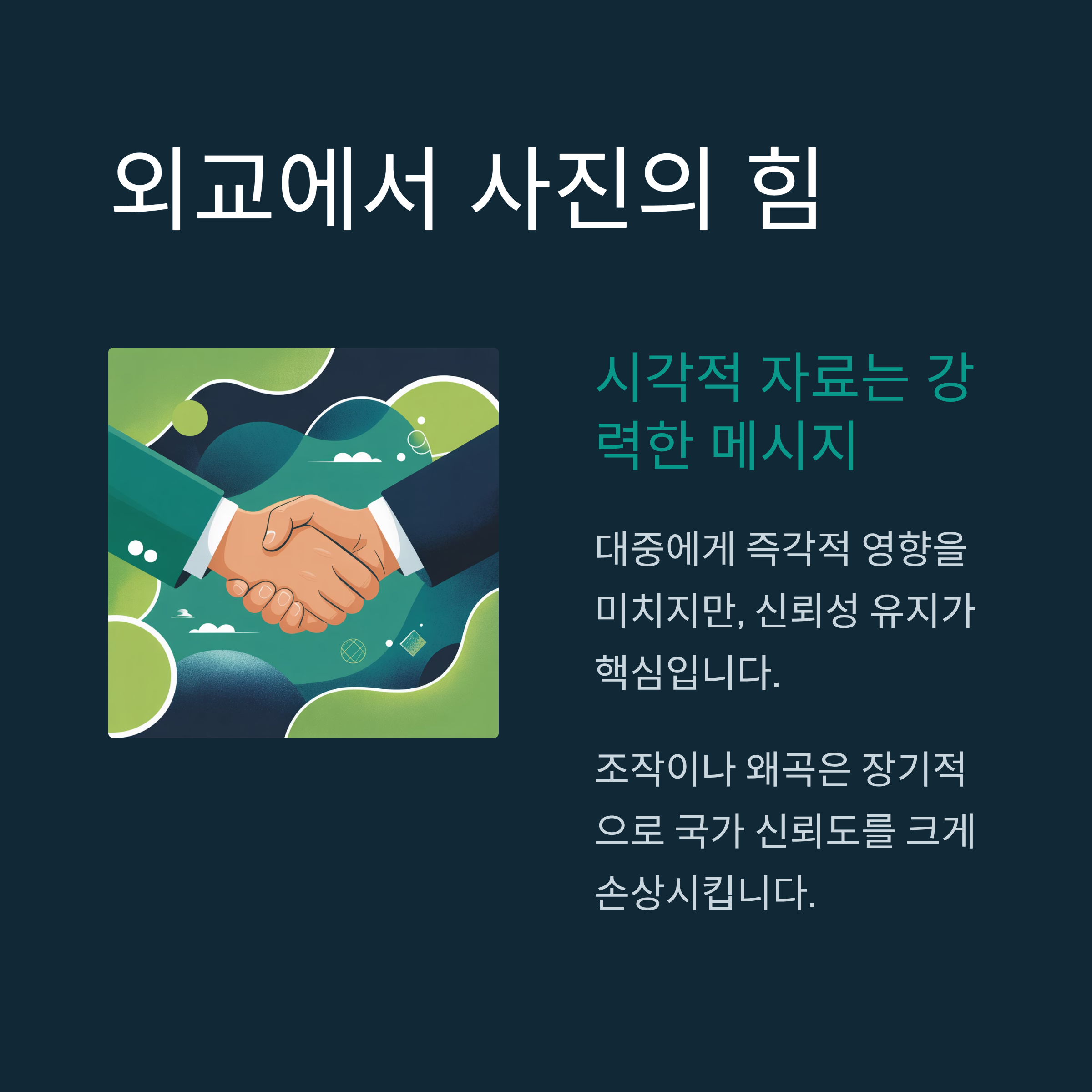 사진과 같은 시각적 자료는 대중에게 강력한 메시지를 전달하지만, 신뢰성 유지가 무엇보다 중요합니다. 한국은 과거 사례를 교훈 삼아, 앞으로는 보다 투명하고 정직한 외교적 소통 방식을 강화해야 할 것입니다.
