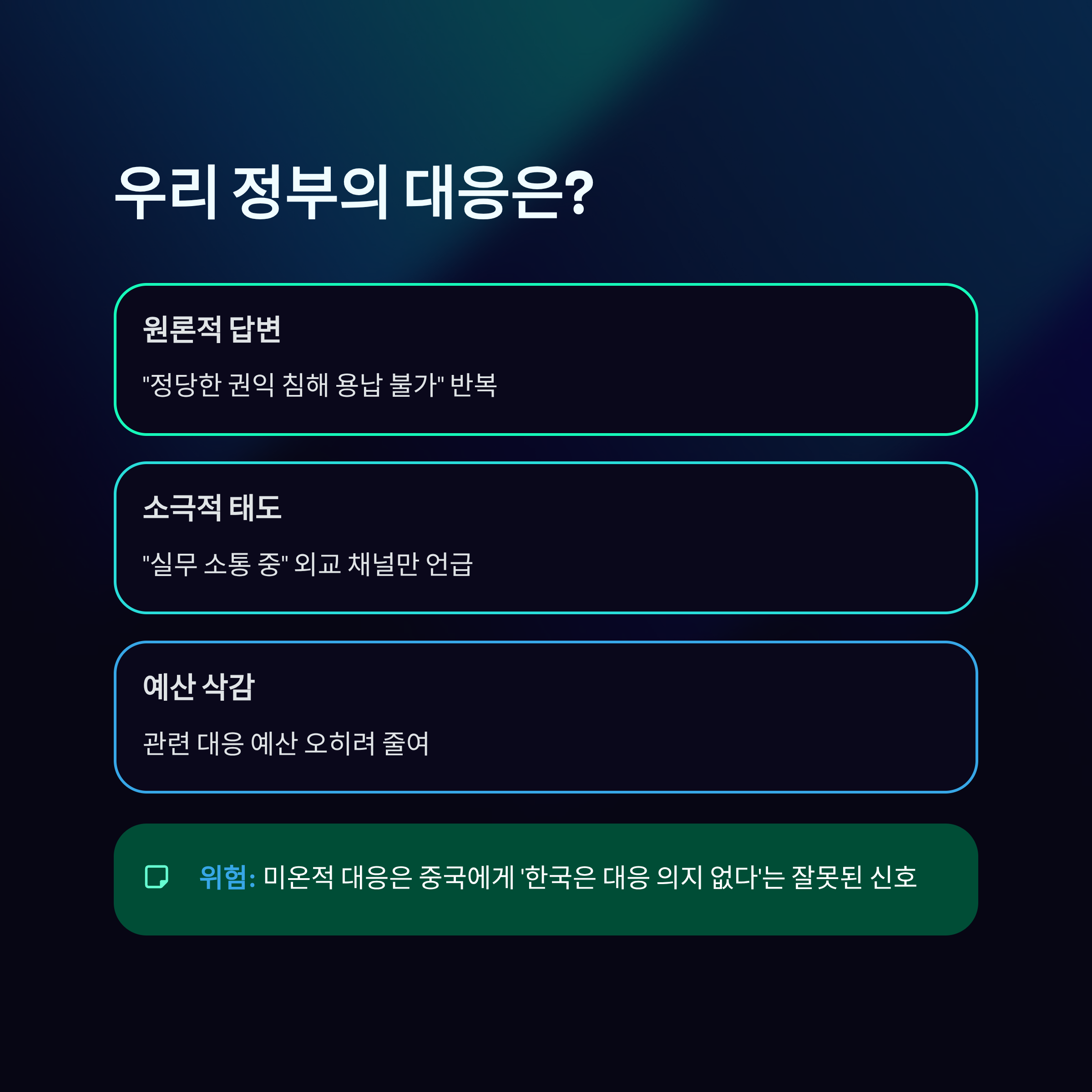 현재 정부의 소극적이고 형식적인 대응은 중국의 오판을 부르고, 결국 돌이킬 수 없는 결과를 초래할 수 있습니다.
