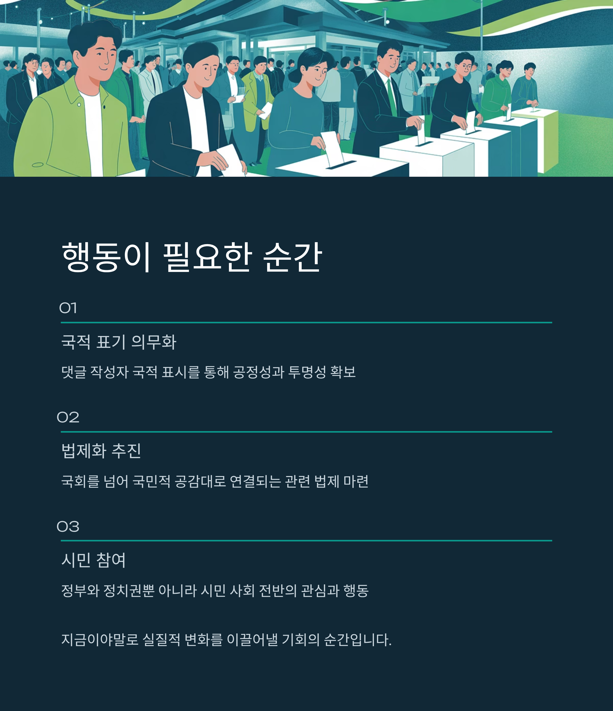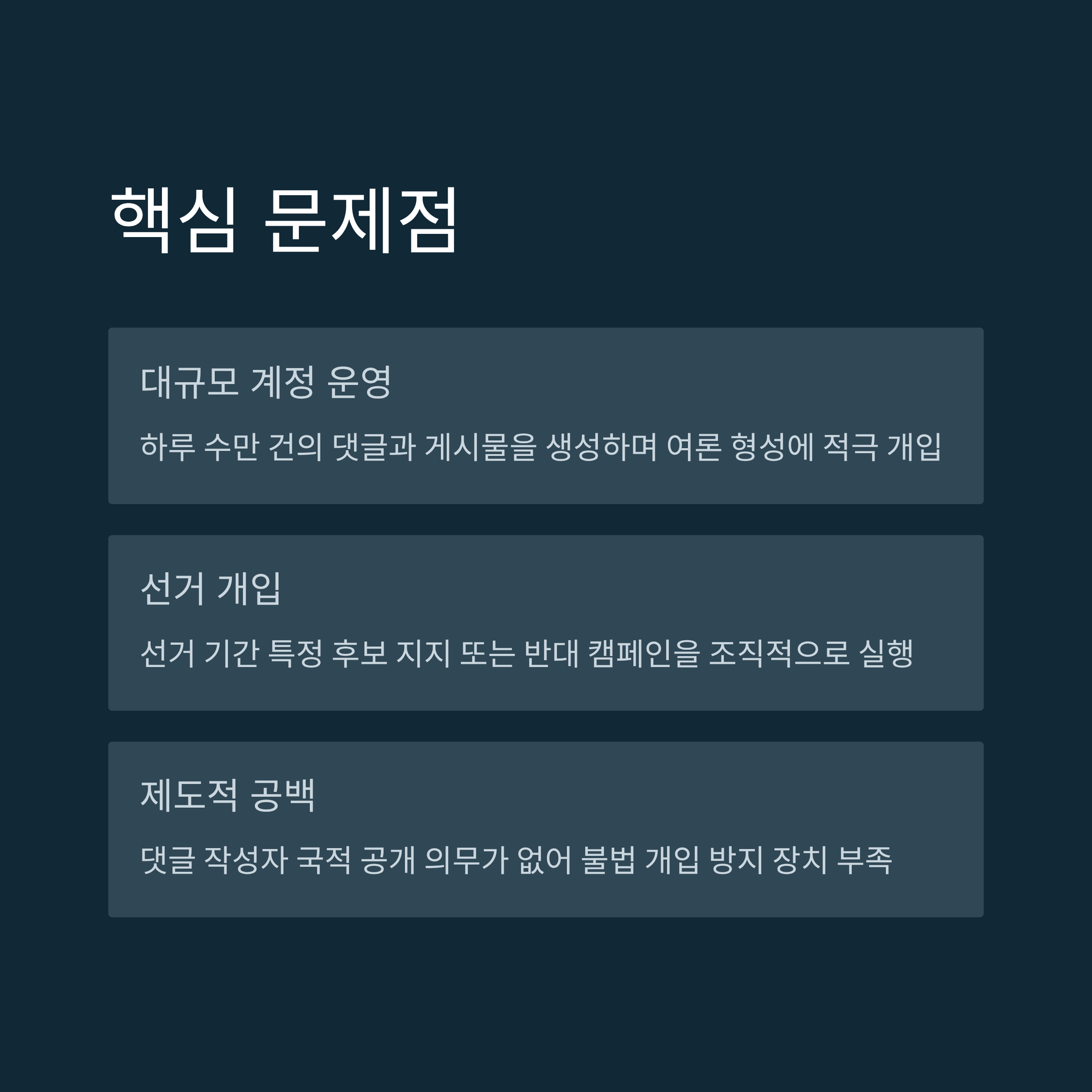 - 현행 제도의 한계: 댓글 작성자 국적 공개 의무가 없어, 불법 개입 방지 장치가 부족.