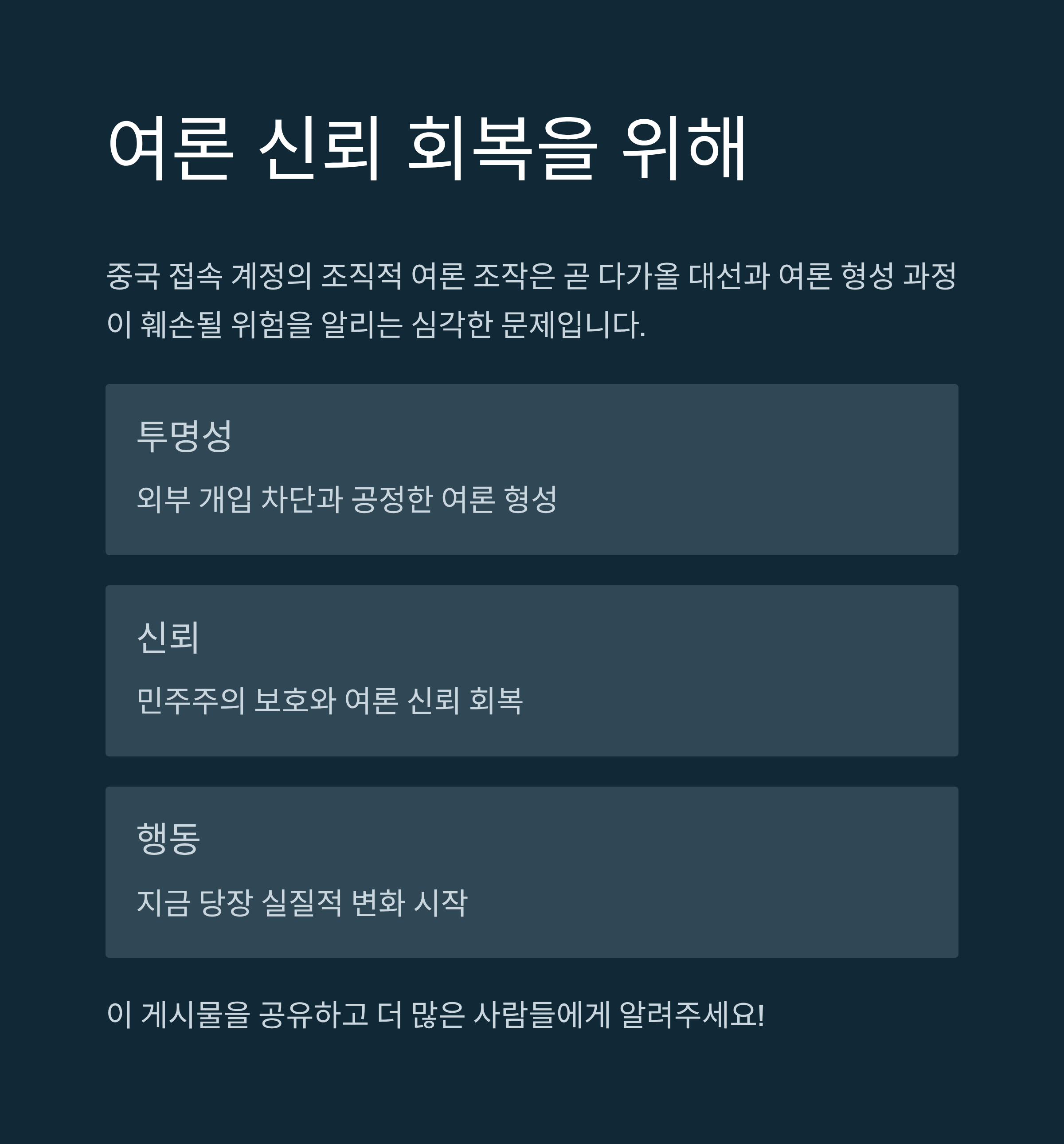 외부 개입을 차단하고, 국내 여론을 보다 투명하게 성장시키기 위해 정부와 정치권뿐만 아니라 시민 사회 전반의 관심과 행동이 요구됩니다. 지금이야말로 실질적 변화를 이끌어낼 기회의 순간입니다.