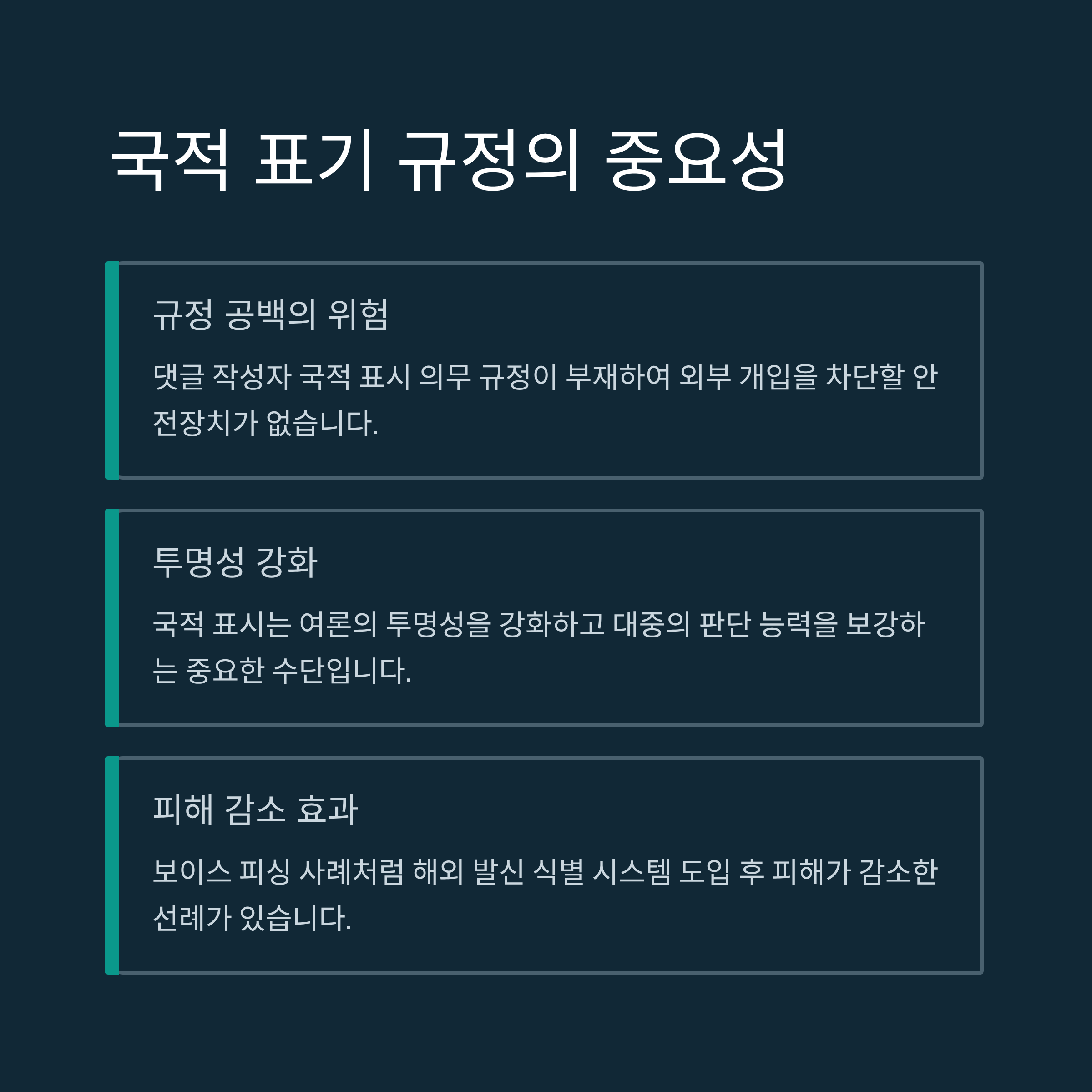 일례로 국제통화 보이스 피싱 사례에서는 해외 발 신호를 식별할 수 있는 시스템 도입 후 피해가 감소한 바 있습니다. 이와 마찬가지로 댓글 계정의 국적을 명시한다면 여론 왜곡이 발생할 확률을 대폭 줄이고, 시민 스스로 정보의 신뢰도를 판단할 수 있는 기회를 제공합니다.