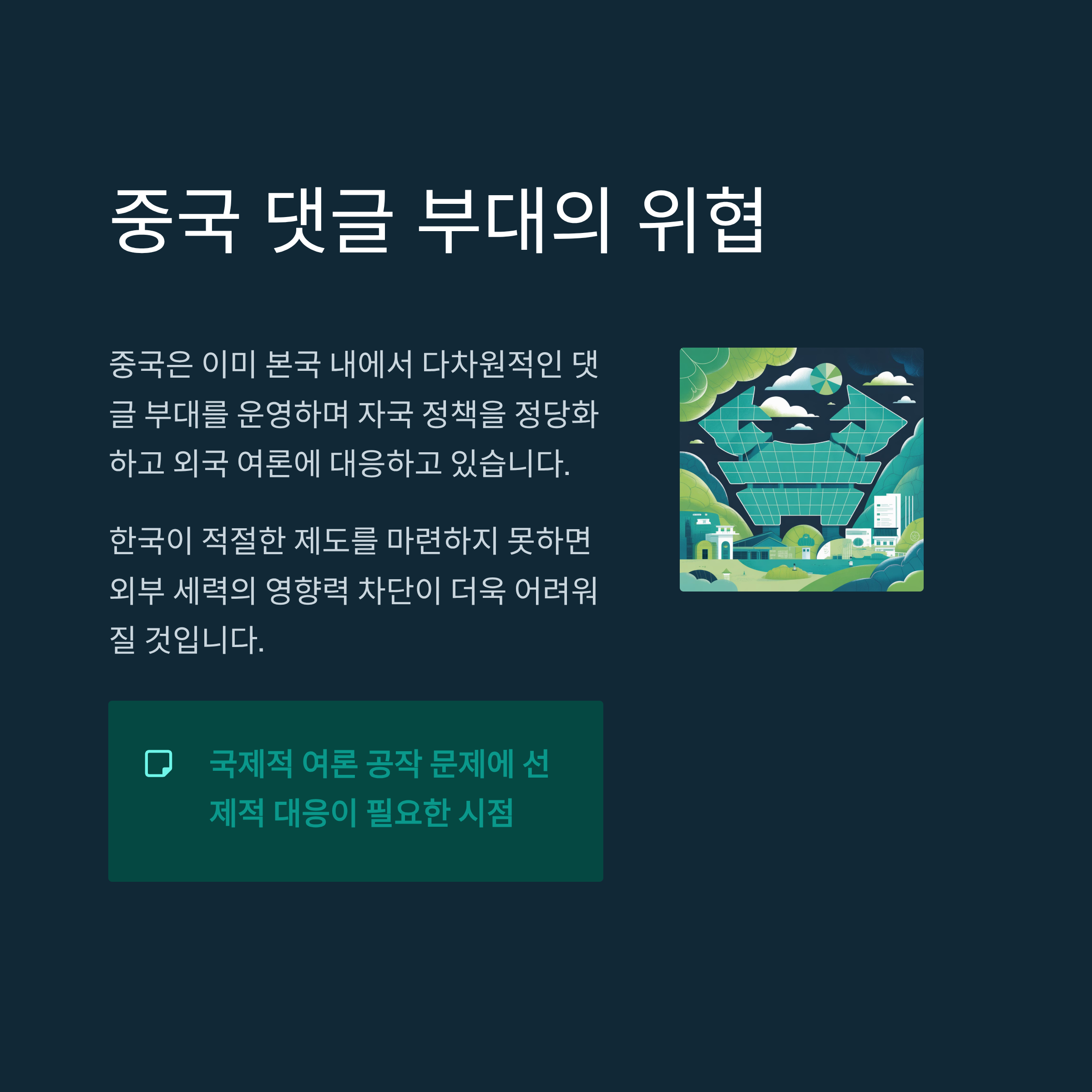 중국은 이미 본국 내에서 다차원적인 댓글 부대를 운영하고 있는 것으로 알려져 있습니다. 심지어 이를 통해 자국 정책을 정당화하고, 외국 세력의 여론 도전에도 대응하고 있습니다. 이 상황에서 한국이 적절한 제도를 마련하지 못한다면, 외부 세력의 영향력을 차단하기는 더욱 어려워질 것입니다.