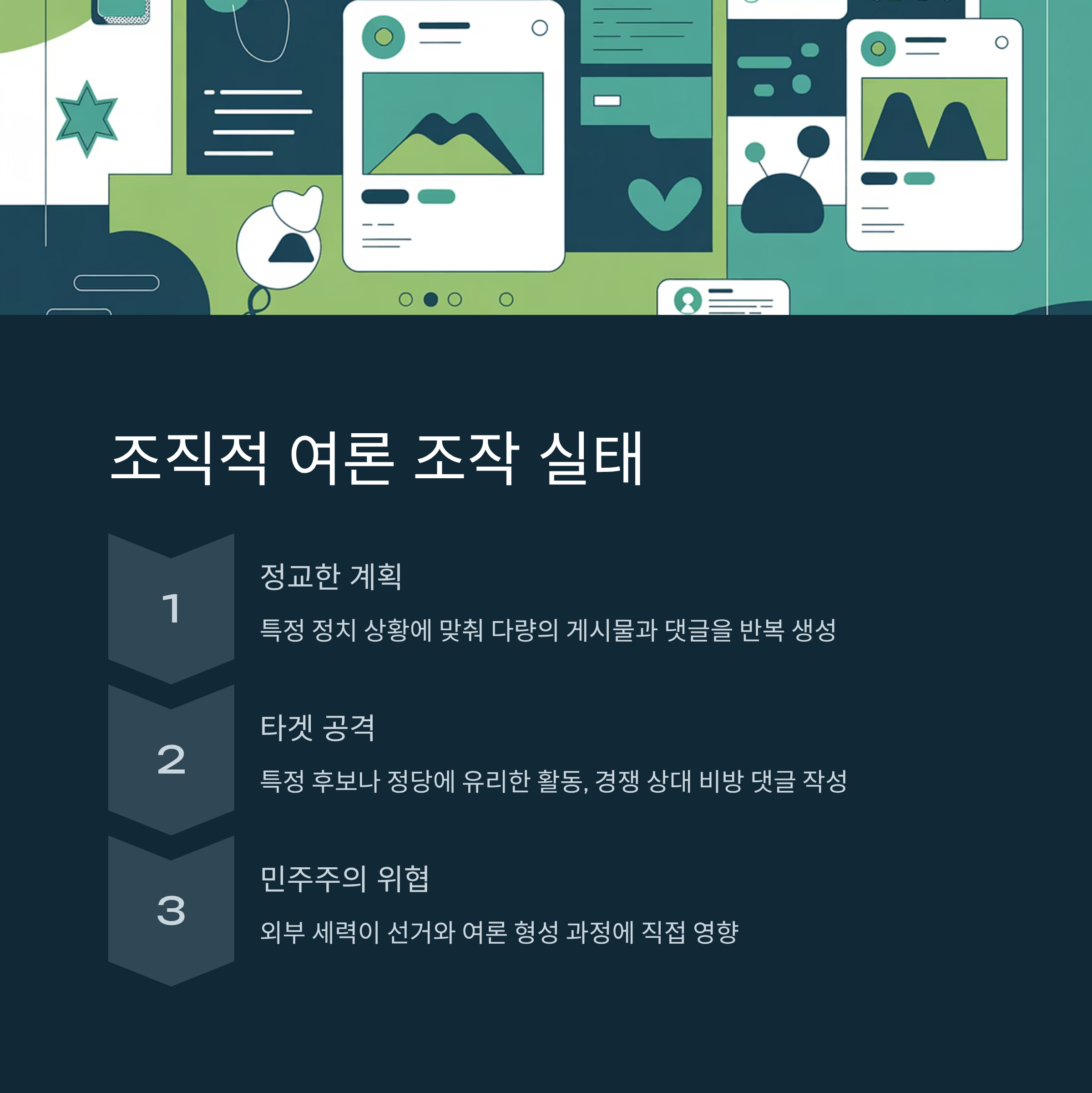 한국 내에서 발견된 여러 의혹 계정들의 활동 기록을 살펴보면 특정 후보 또는 정당에 유리한 방향으로 활동하거나 경쟁 상대에 대한 비방성 댓글 작성이 확인되었습니다. 이런 조직적 개입은 외부 세력이 한국 국민인 척 위장해 민주주의의 핵심인 선거와 여론 형성 과정에 영향을 미치고 있다는 점에서 상당히 심각한 문제라 할 수 있습니다.