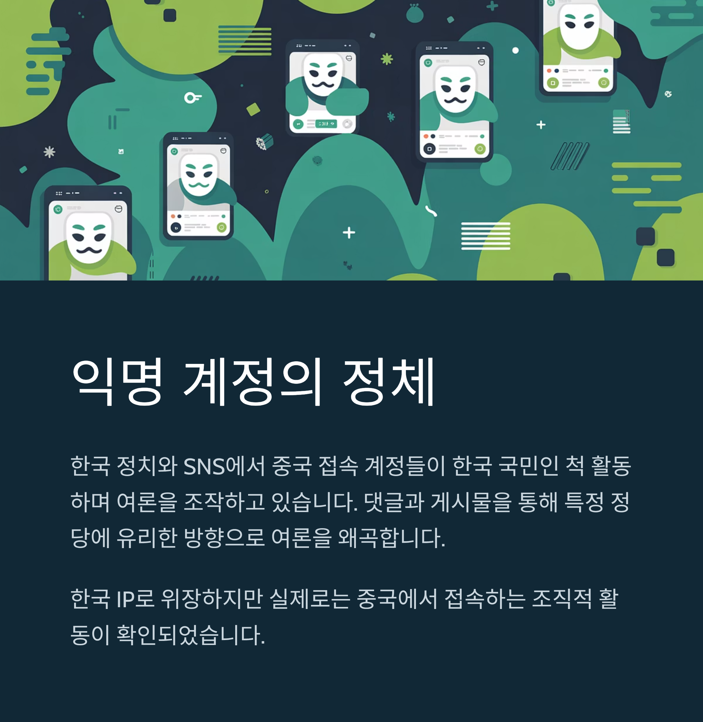 - 익명의 중국 접속 계정들이 한국 국민으로 위장해 여론 형성에 적극 개입 중.