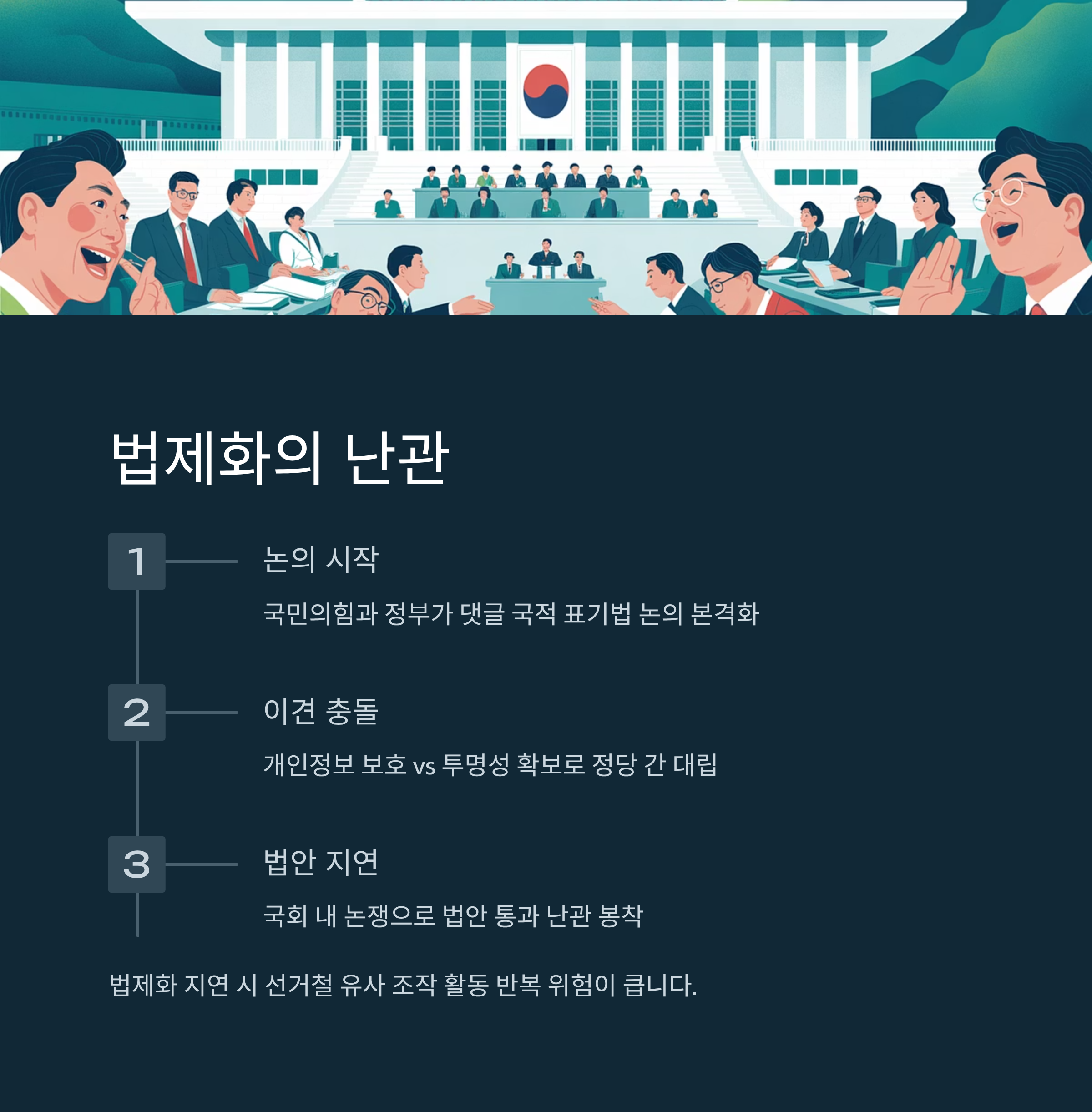 법제화 논의가 계속 지연되면, 선거철에 유사한 조작 활동이 반복될 위험이 큽니다. 따라서 국적 공개 논의는 보다 시급하고 심각히 다뤄져야 할 의제입니다. 국민적 합의를 기반으로 정치권에서의 합리적 타협이 절실합니다.