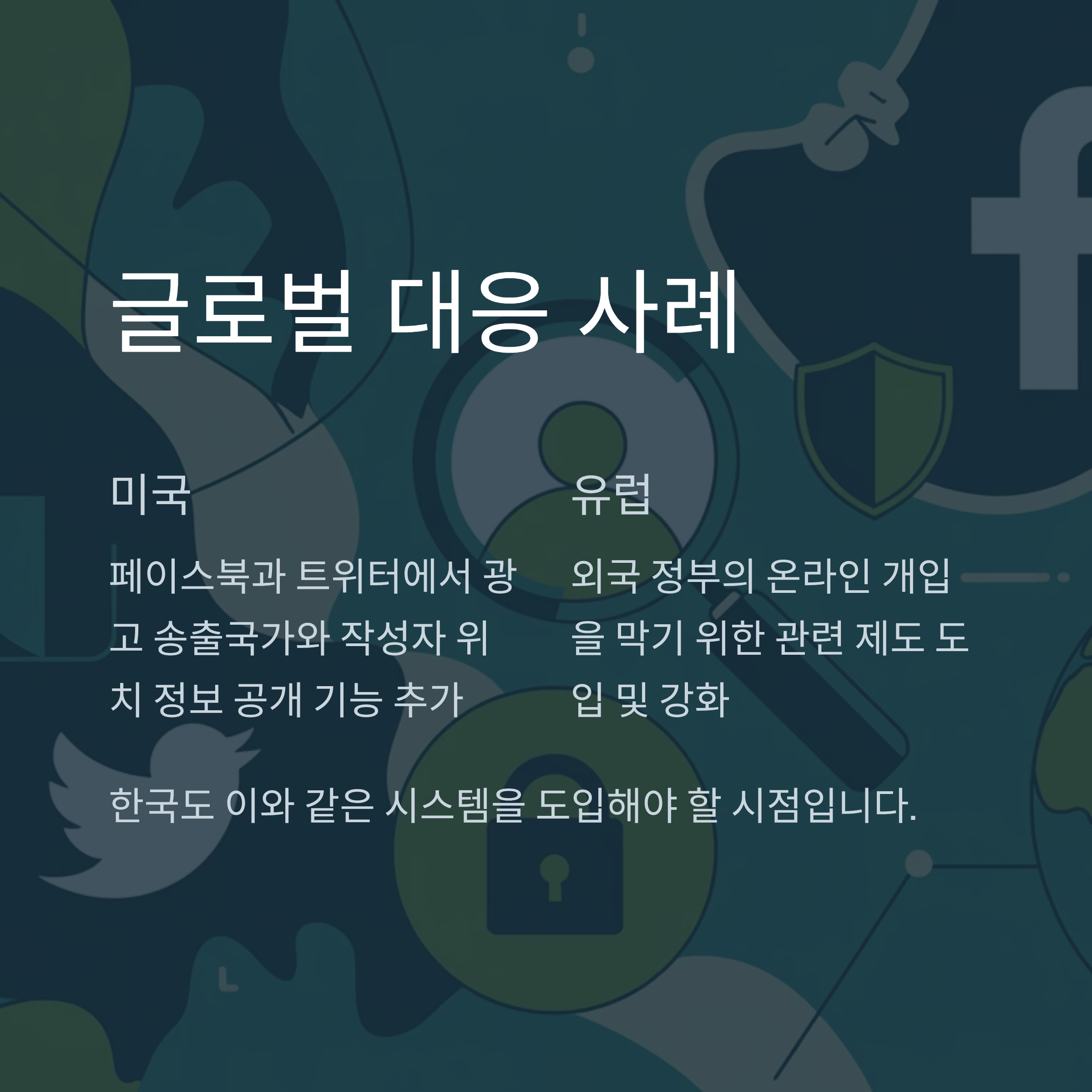 미국과 유럽 일부 국가는 이미 외국 정부나 집단의 온라인 개입을 막기 위해 관련 제도를 도입하거나 강화하였습니다. 예를 들어, 페이스북과 트위터는 일정 게시물에 대해 광고 송출국가나 작성자의 위치 정보를 공개하는 기능을 추가하여 여론 왜곡 문제를 부분적으로 해결하고 있습니다. 한국도 이와 같은 시스템을 도입해야 할 시점입니다.